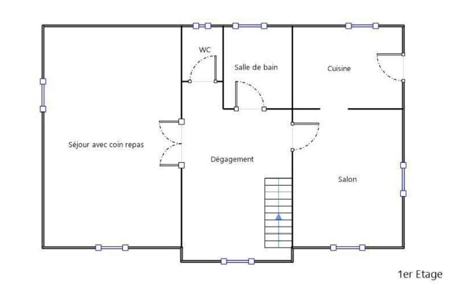 Le 1er étage est constitué d’un palier, un grand séjour lumineux, une cuisine avec accès à la terrasse, une salle à manger, une salle de bains & un WC.