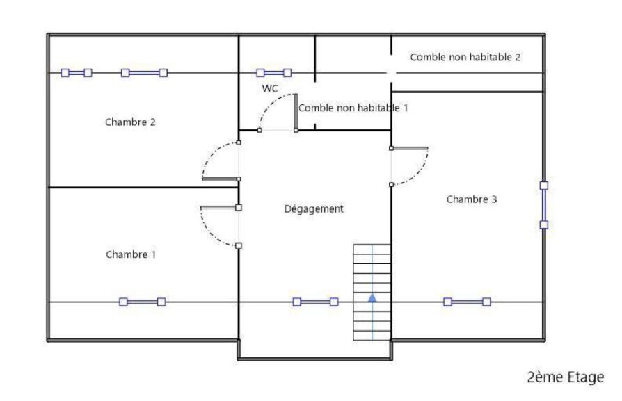 Le 2ème étage est constitué d'un dégagement, de trois chambres & un WC.