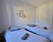 Il se compose d'un séjour avec un canapé convertible, d'une cuisine ouverte et équipée (plaque électrique, hotte aspirante, réfrigérateur, micro-ondes), d'une chambre avec deux lits simples et un placard de