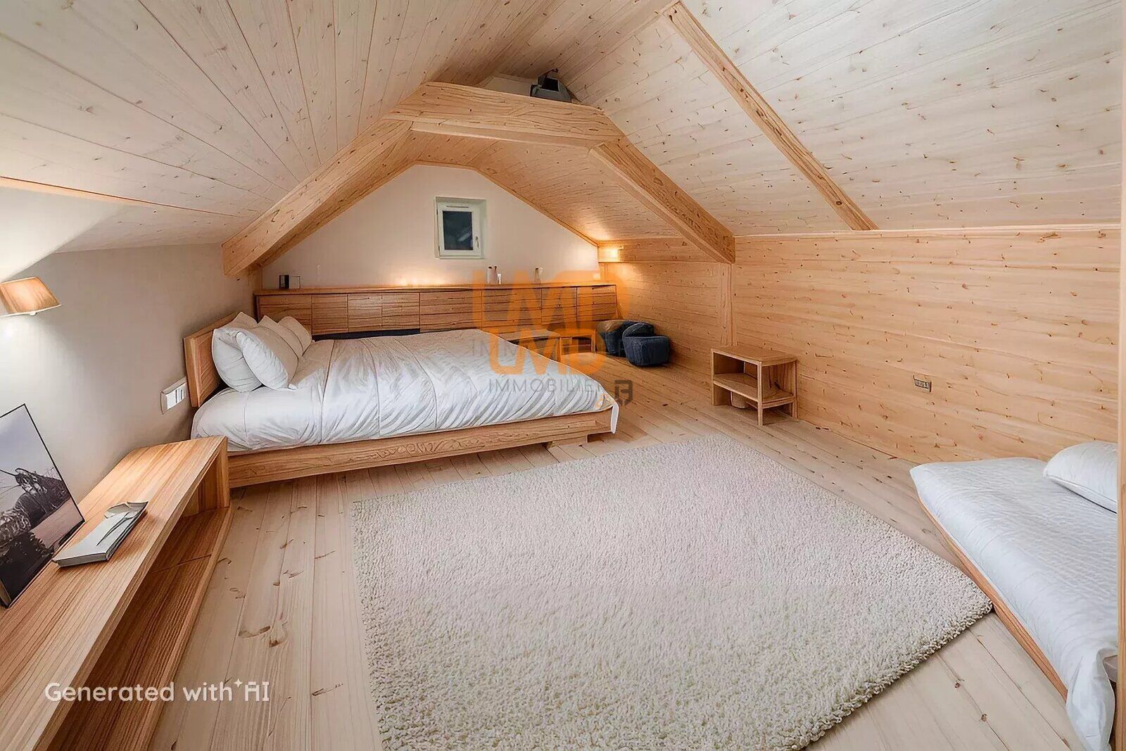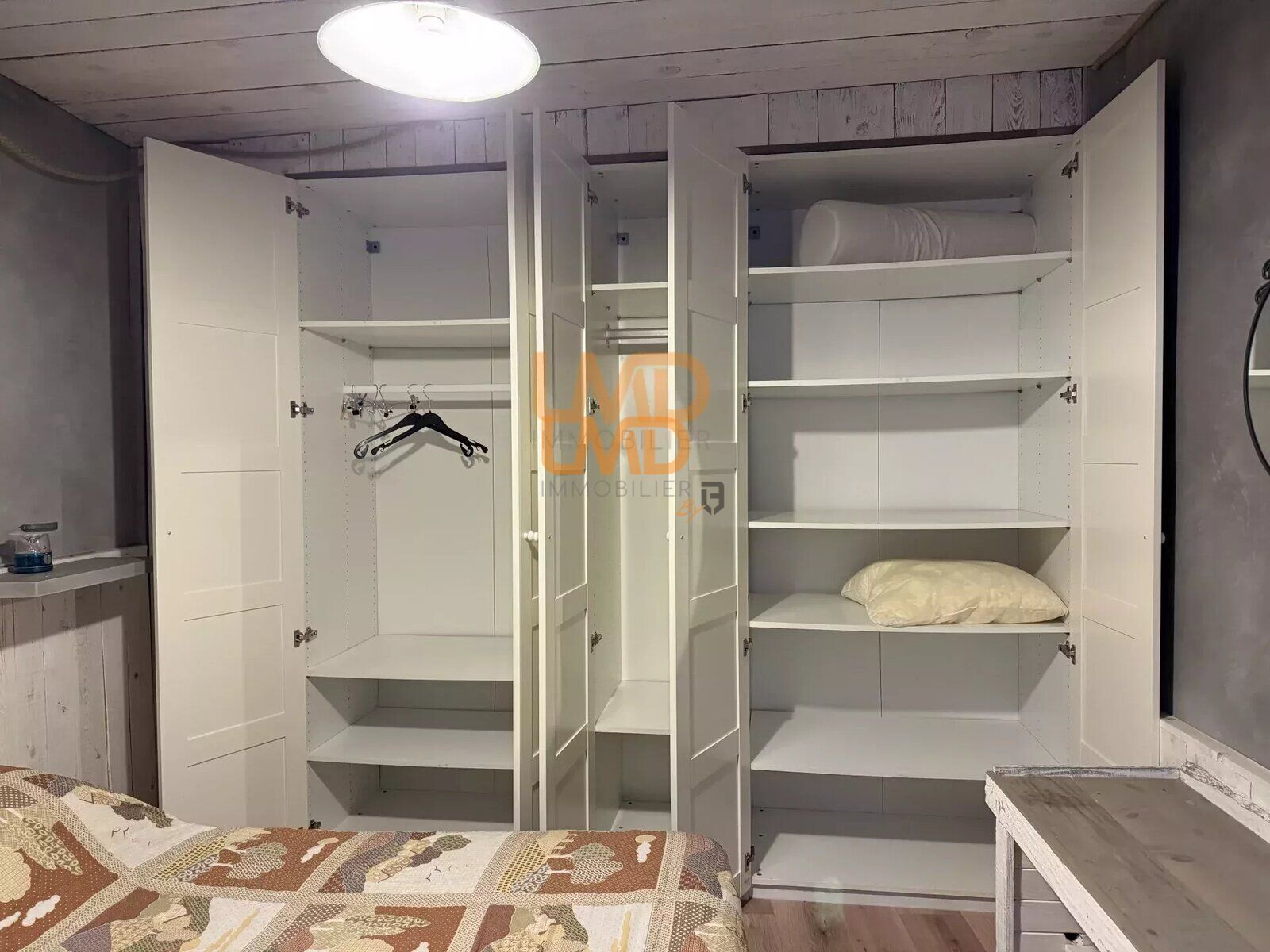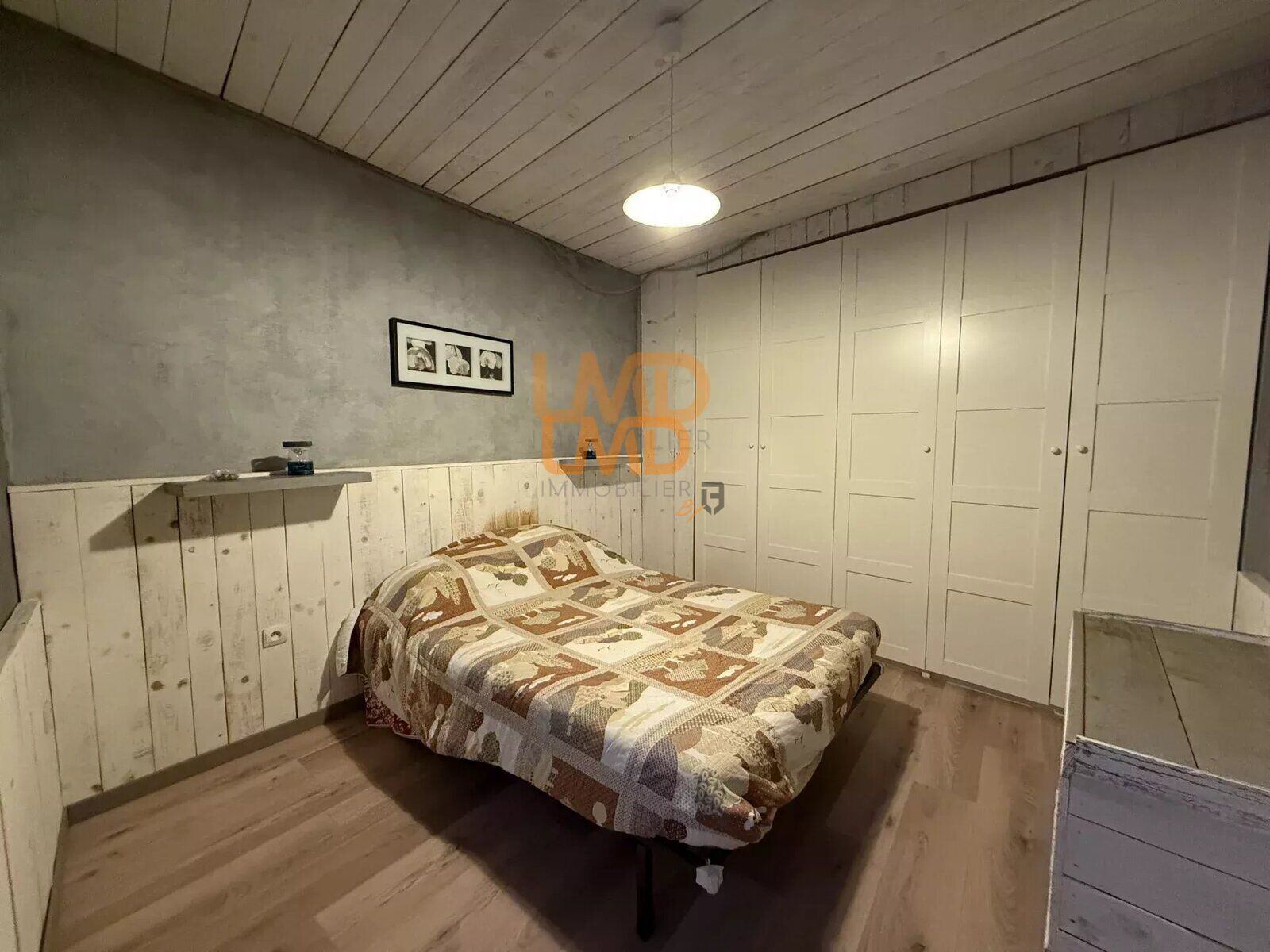 L'étage accueille deux chambres lumineuses équipées de placards intégrés et de convecteurs à inertie sèche. Le dernier niveau mène à des combles aménagés, offrant un espace supplémentaire.