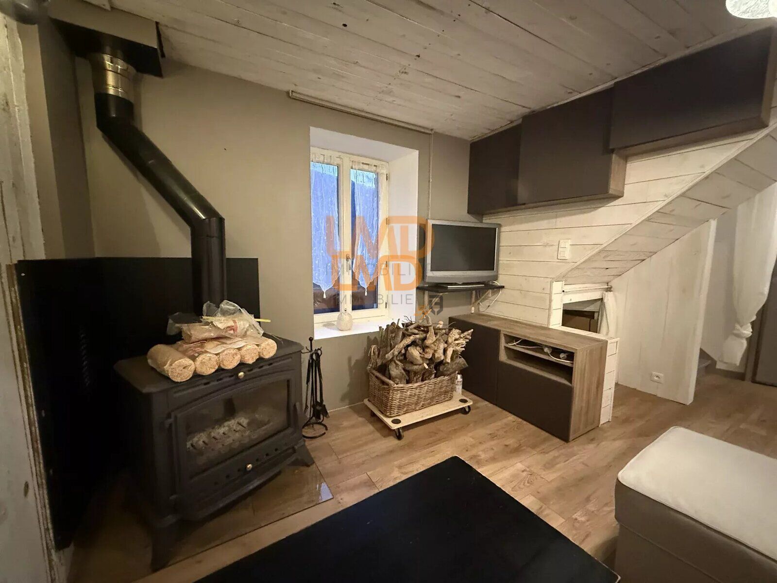 Au rez-de-chaussée, la maison dispose d'une salle à manger avec cuisine ouverte et équipée, d'un salon chaleureux agrémenté d'un poêle à bois, d'une salle d'eau et d'un WC indépendant.