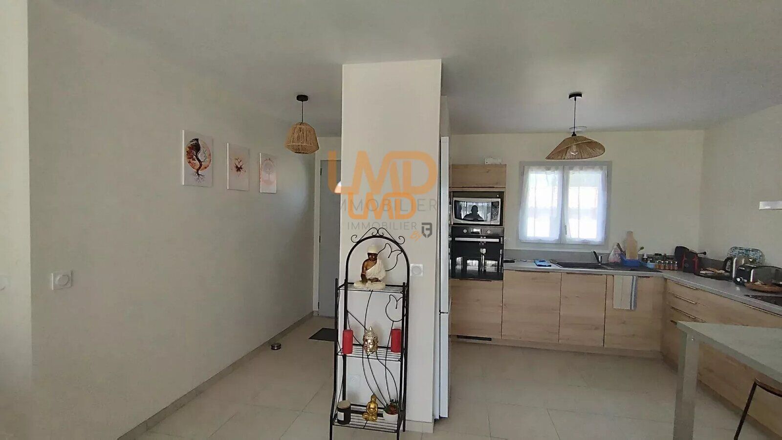 L'intérieur de la maison dispose d'une cuisine ouverte et lumineuse, parfaite pour accueillir famille et amis. Les fenêtres coulissantes en aluminium et PVC inondent les pièces de lumière naturelle tout en offrant une excellente isolation. Les équipements modernes tels que les volets électriques et l'accès à la fibre optique garantissent un confort quotidien optimal.