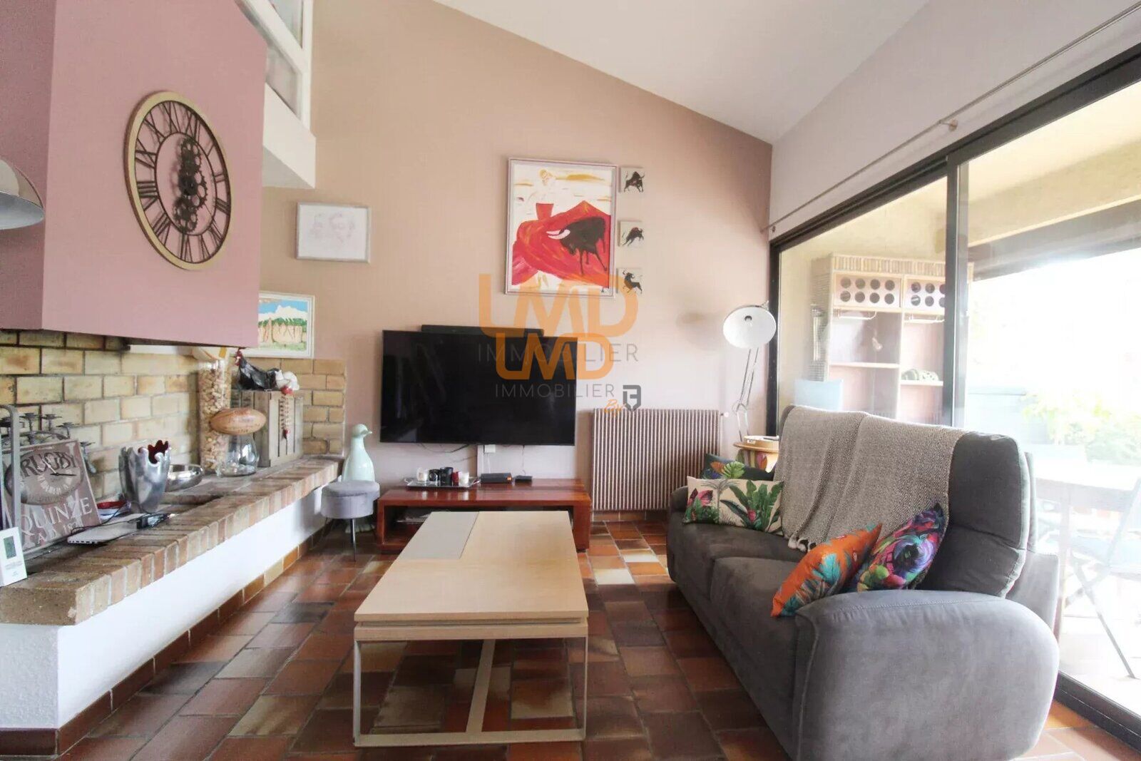 Pièce de vie lumineuse avec plafond cathédrale, accès direct à la terrasse et jardin.