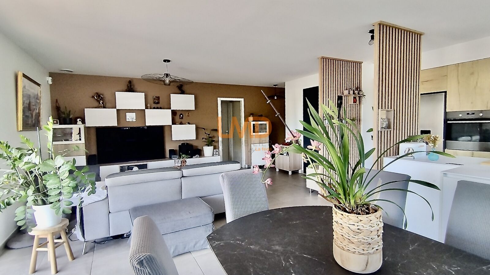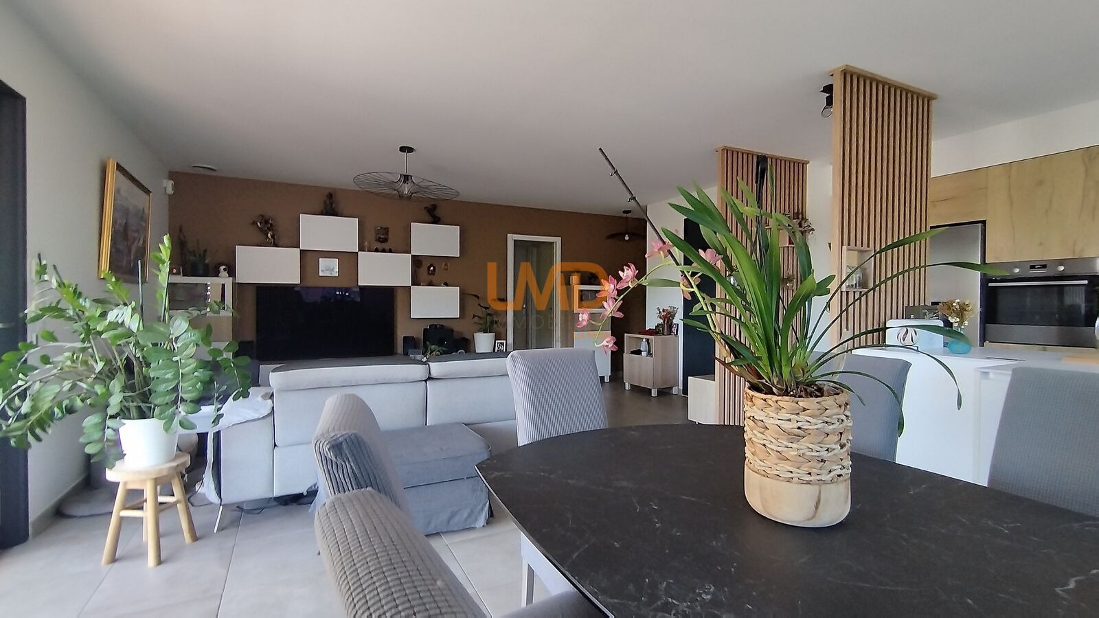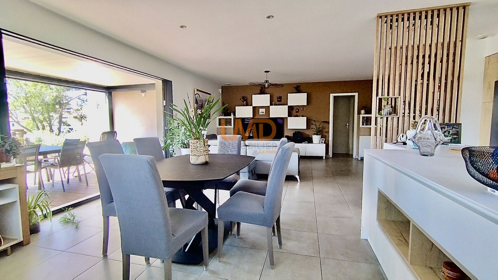 Un vaste séjour baigné de lumière naturelle, ouvert sur l’extérieur grâce à de larges baies vitrées à galandage. L’espace de vie accueille facilement salon et salle à manger, avec une belle continuité vers la terrasse.