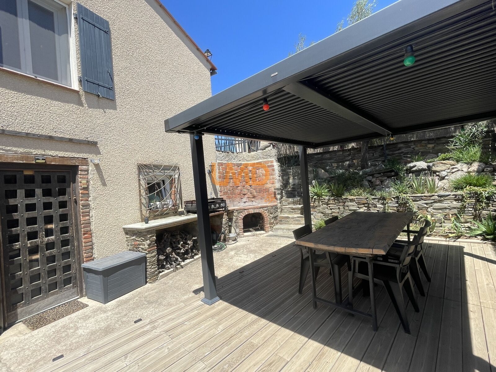 Coin barbecue avec pergola bioclimatique, piscine coque 7x3.