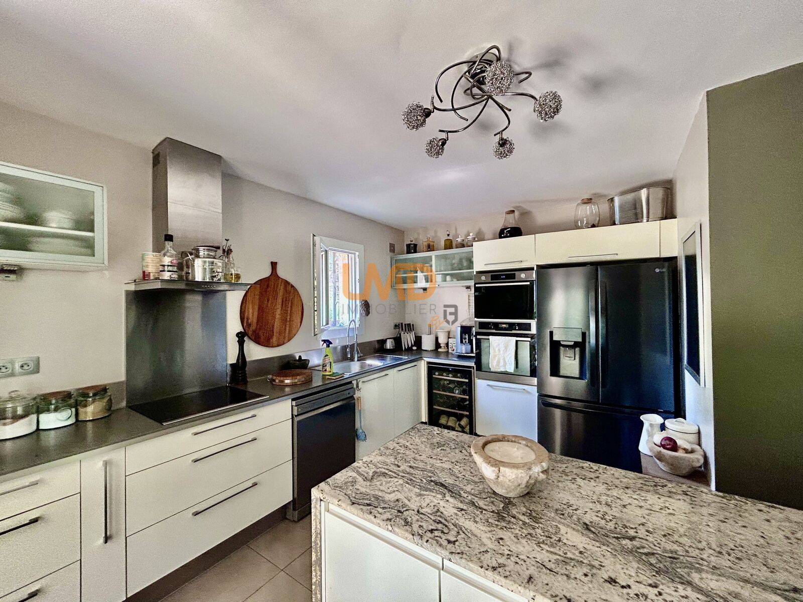 La cuisine est ouverte équipée et aménagée avec le comptoir en granit et un accès direct à la terrasse