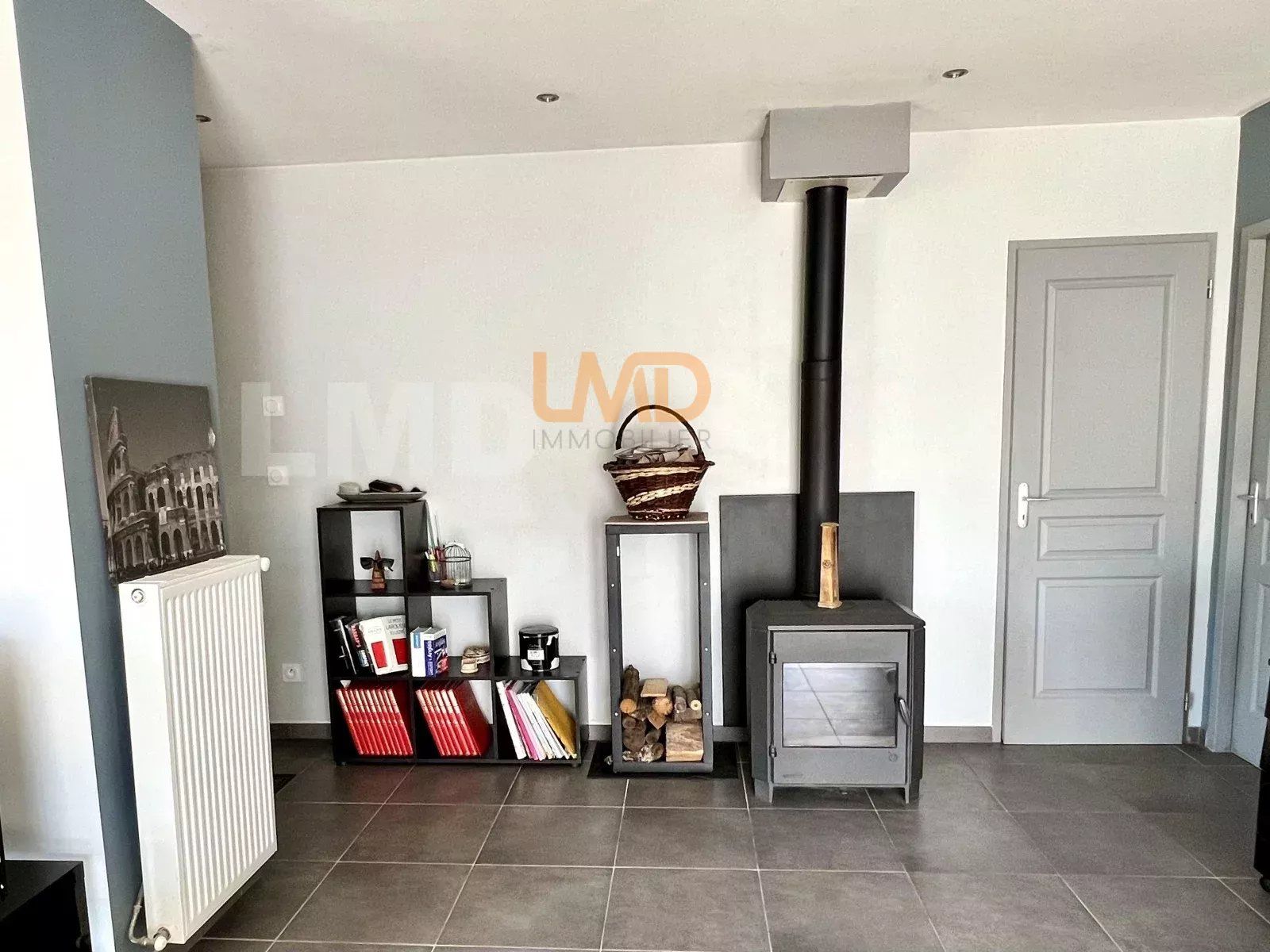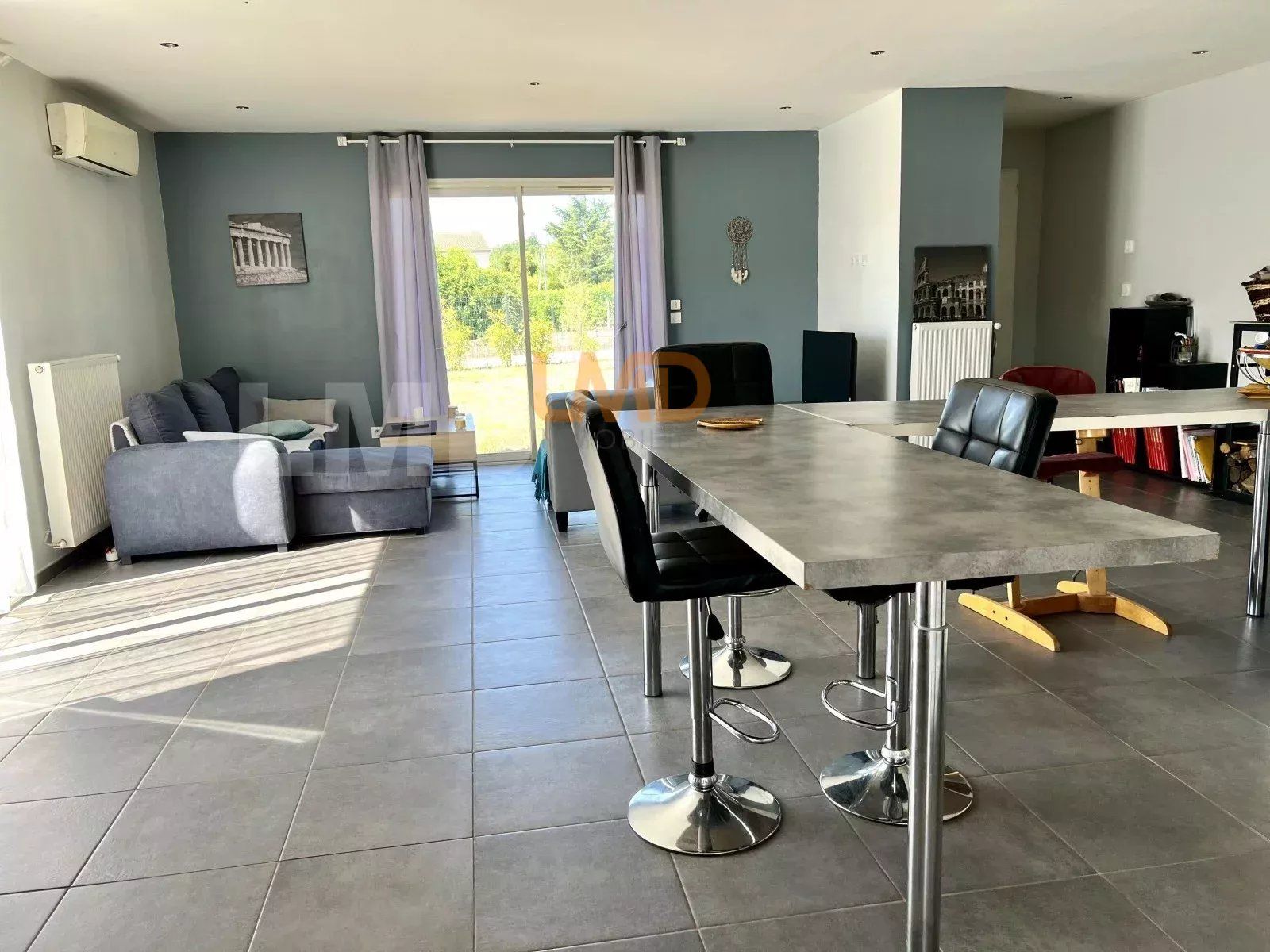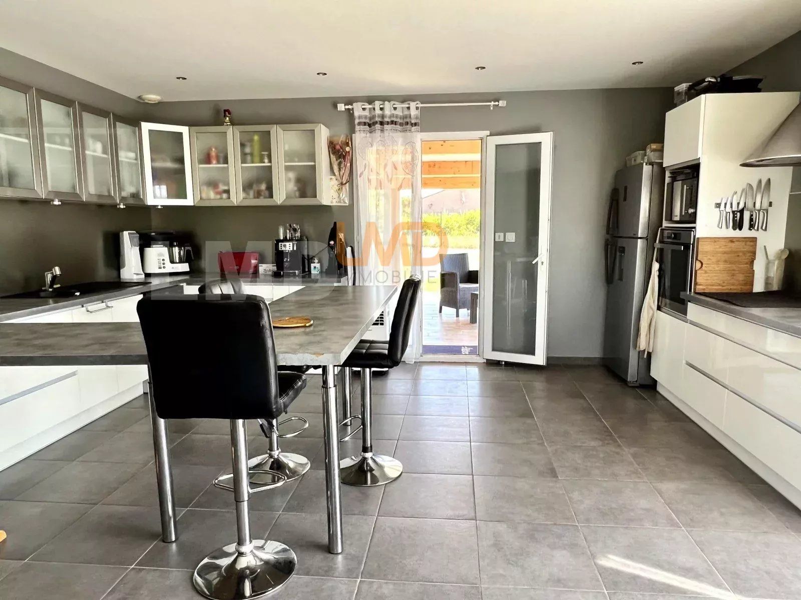 Cette maison de plain pied offre une vaste pièce de vie avec coin cuisine américaine, poêle à bois et des baies vitrées ouvertes sur différentes orientations dont une terrasse couverte de 35m2 exposée Est .