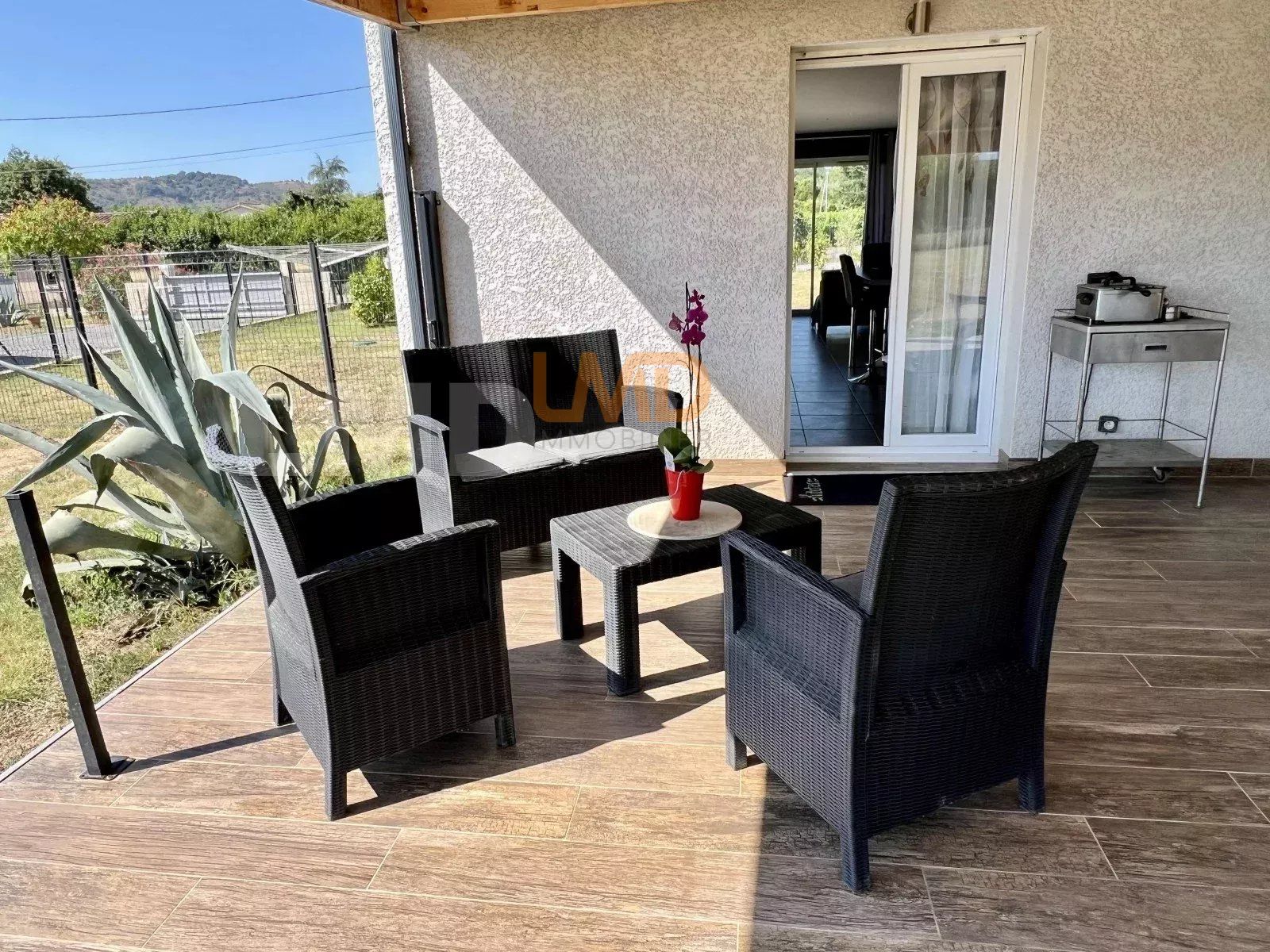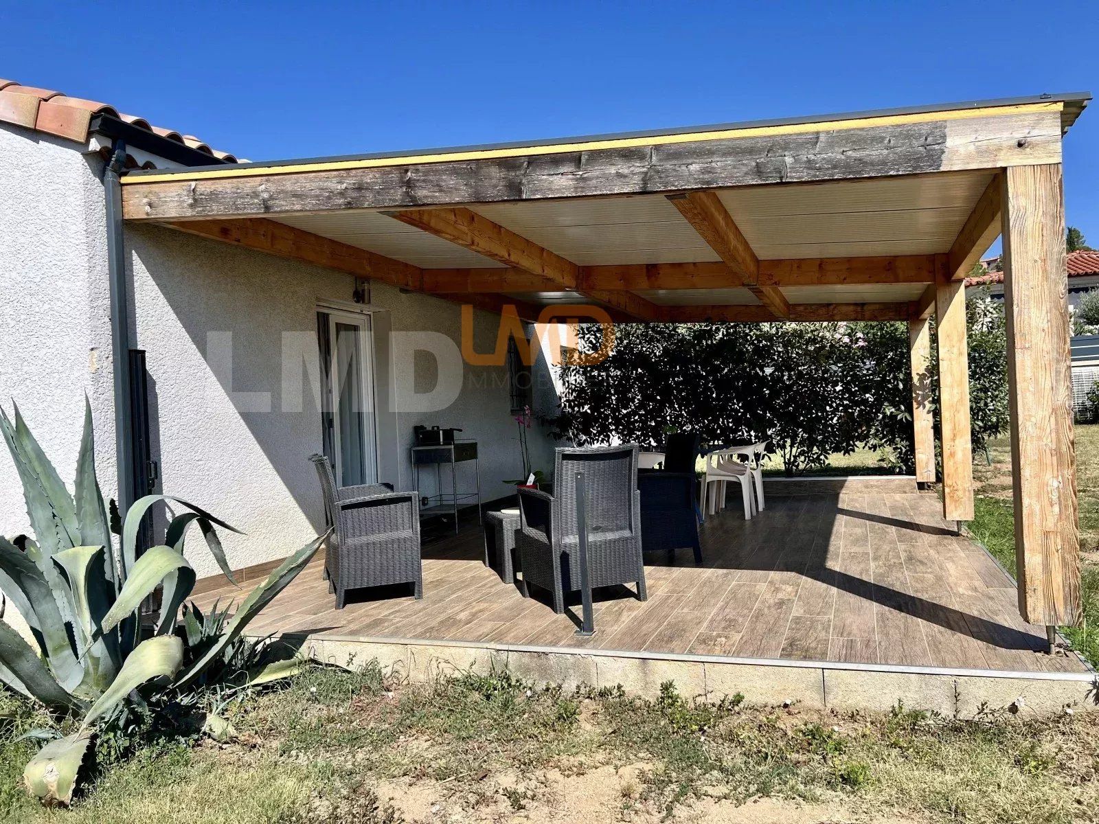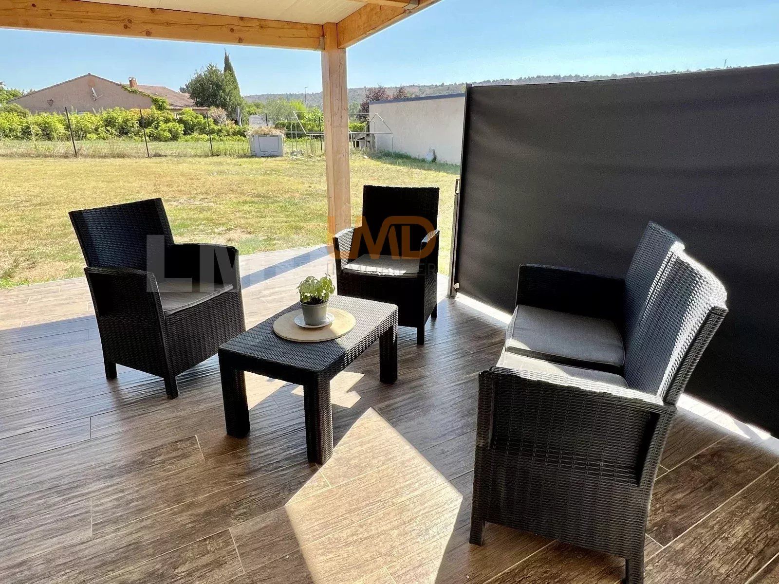 Cette maison de plain pied offre une vaste pièce de vie avec coin cuisine américaine, poêle à bois et des baies vitrées ouvertes sur différentes orientations dont une terrasse couverte de 35m2 exposée Est .