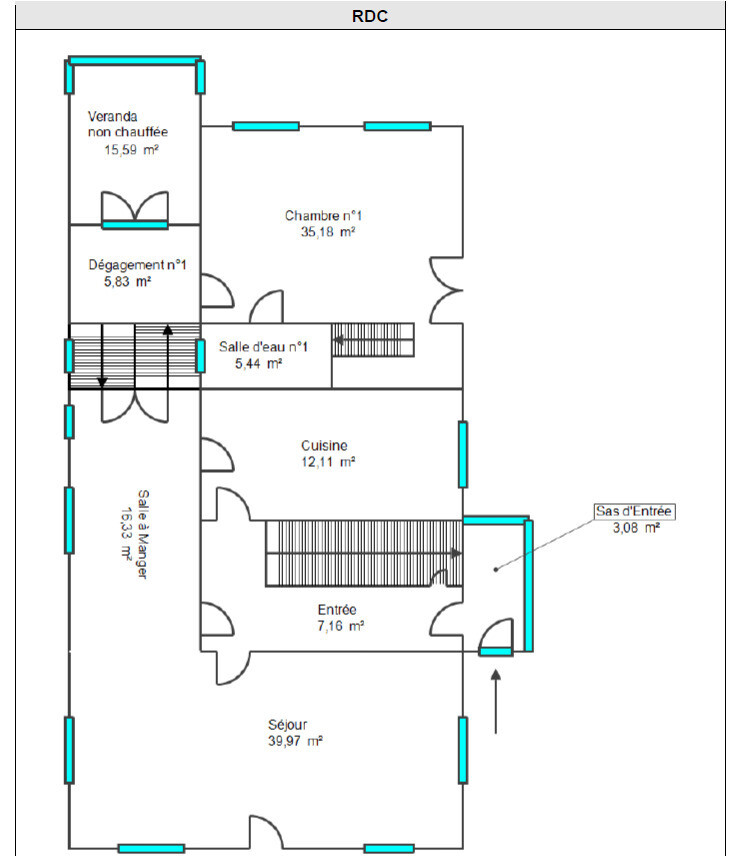 Nous entrons dans un sas vitré avec porte et baie coulissante, 1 dégagement de 7m² donnant sur une vaste pièce ouverte le séjour et salle à manger de 56m², très lumineuse ainsi qu'une cuisine de 12m².