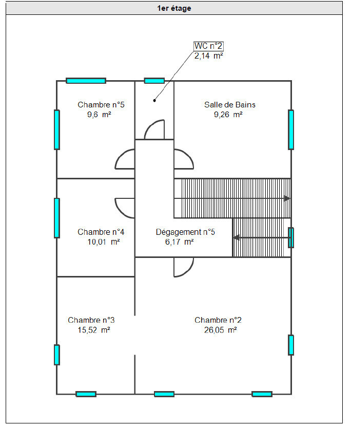 Au 1er étage vous trouverez 4 chambres de 26m², 16m² et 2x 10m² avec également un dégagement de 6m² ainsi qu'une salle de bain de 9m².