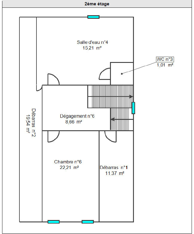 Au 2e étage vous bénéficierez d'une chambre de 22m², d'une salle d'eau de 15m², d'un wc, d'un débarras de 11m² ainsi qu'un dégagement de 9m². Des rangements sont existants sous chaque pente de toit (20m²).