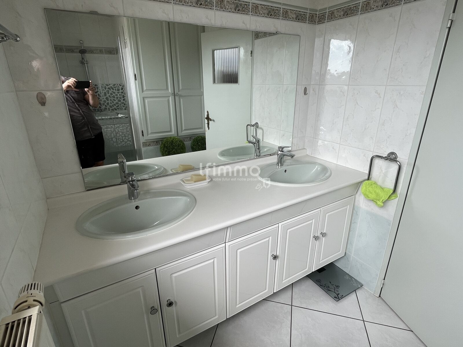 À l’étage : 3 chambres, une salle d’eau moderne avec meuble double vasque, placard et rangements