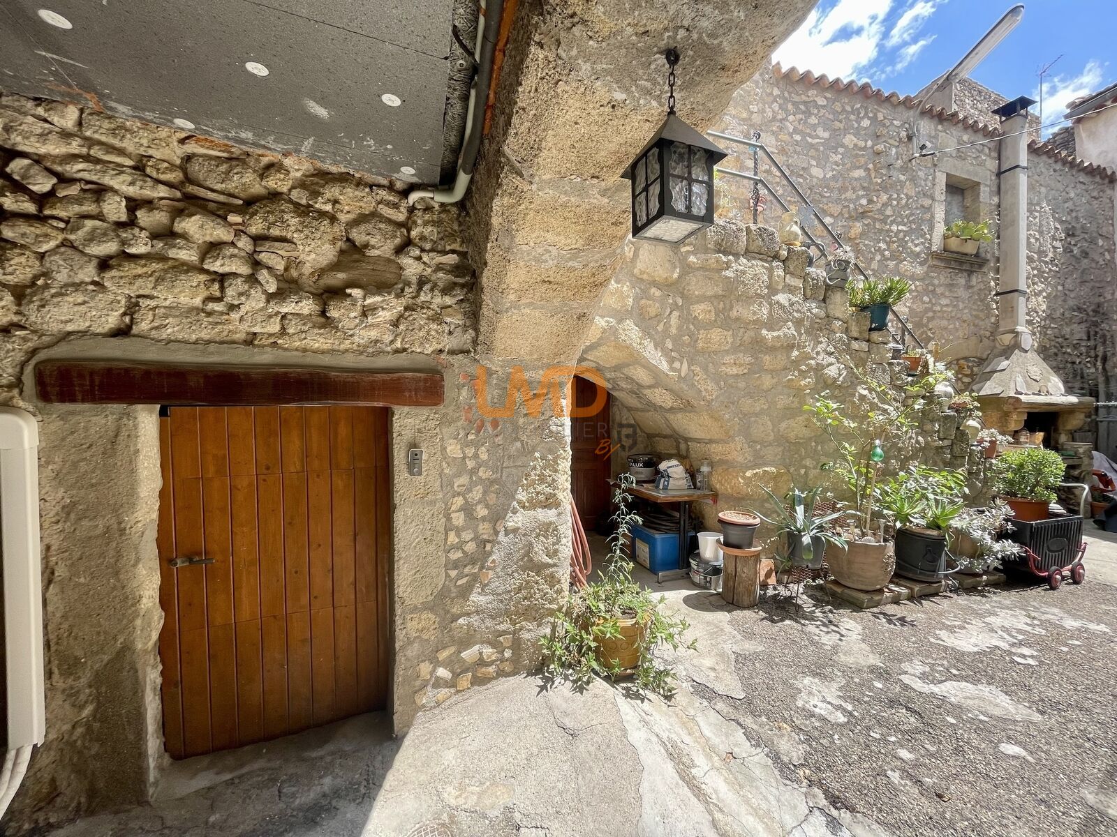 L’accès se fait par un porche vouté, sous la maison, débouchant sur une cour commune soignée, avec barbecue maçonné, pots de plantes, un esprit de village méridional typique.