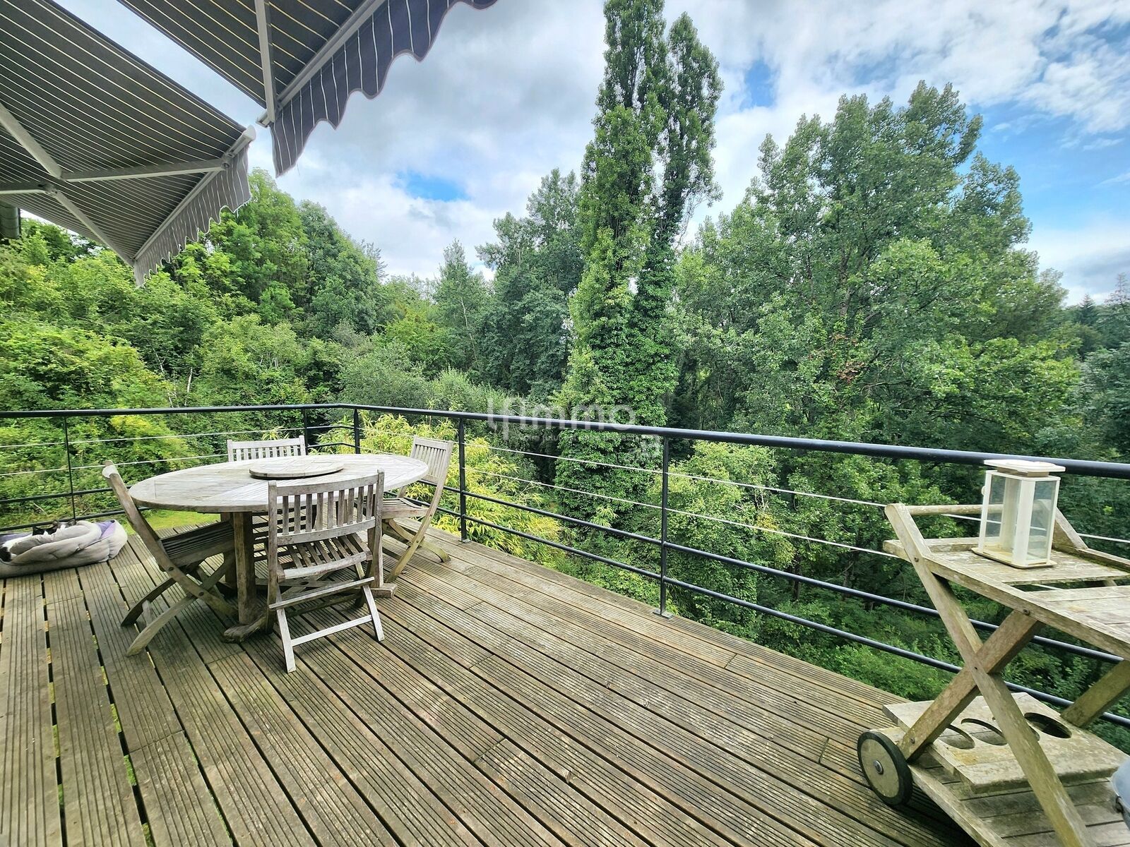 Implantée sur un terrain de 2,5 hectares en pente (environ 40 degrés), la maison se trouve au même niveau de la route, avec une vue dégagée sur une clairière et une rivière en contrebas.