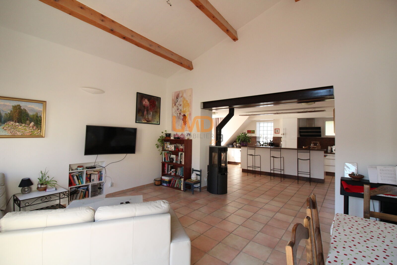 Grande pièce de vie lumineuse d’environ 65 m² avec cuisine ouverte entièrement équipée, séjour chaleureux et poêle hybride bois + granulés pour une ambiance cocooning.