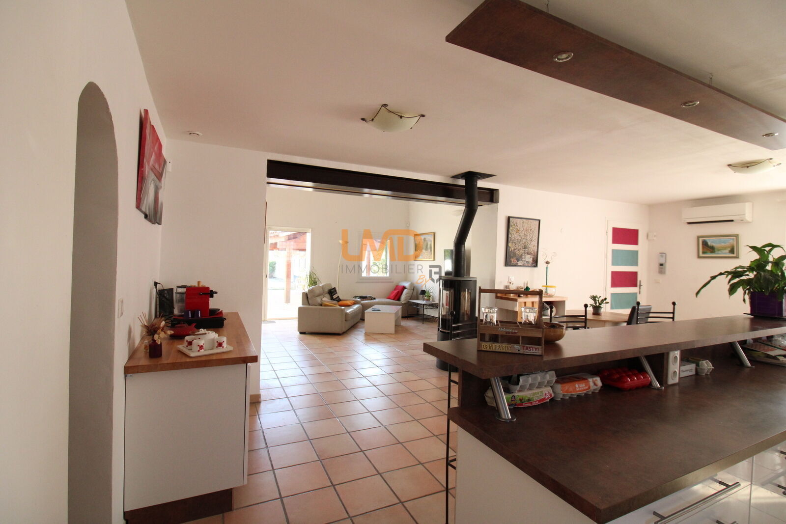 Pièce de vie ouverte avec salon, cuisine équipée et coin repas.