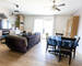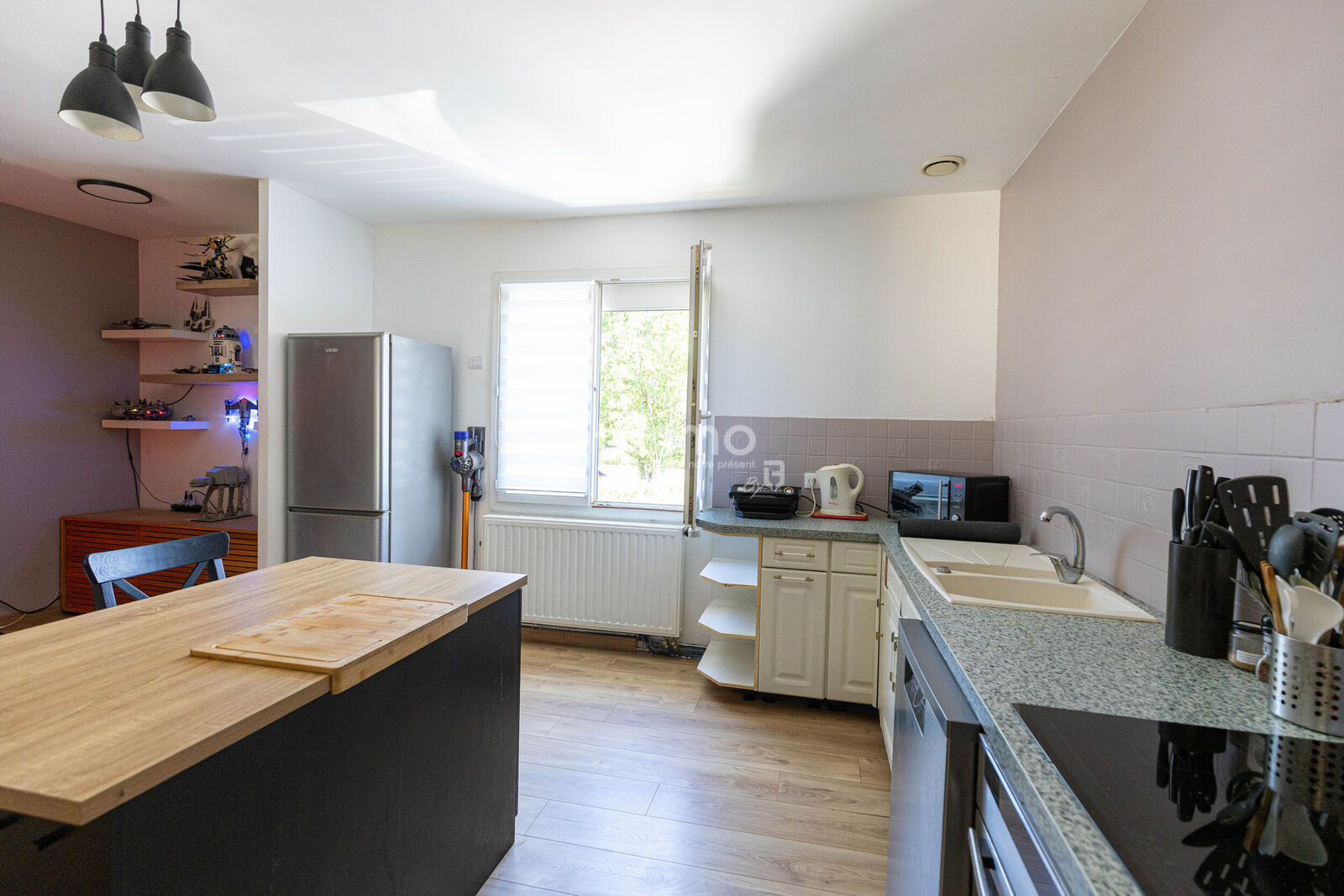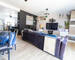 La pièce de vie principale, avec sa cuisine aménagée ouverte sur le salon-séjour, crée un espace convivial où tout semble naturellement fluide.