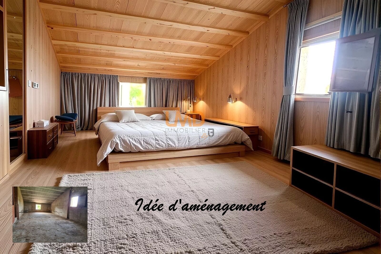 À l'étage, un palier, deux chambres dont une avec balcon, une salle d'eau avec WC et un grenier aménageable de 60 m² environ.