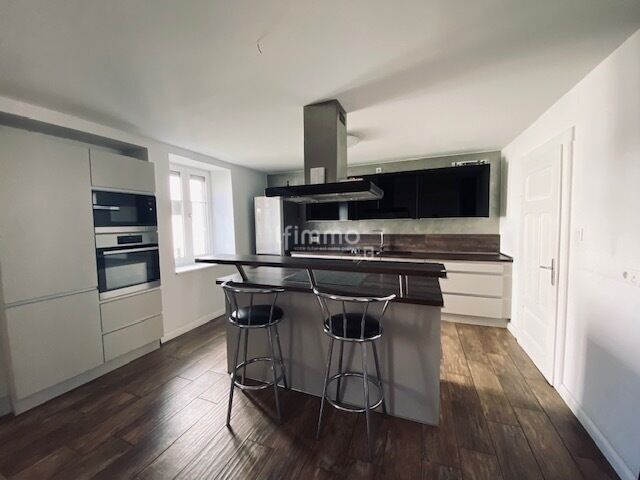 Une cuisine moderne avec îlot central, ouverte sur la salle à manger et un grand séjour lumineux agrémenté d'un poêle à bois.