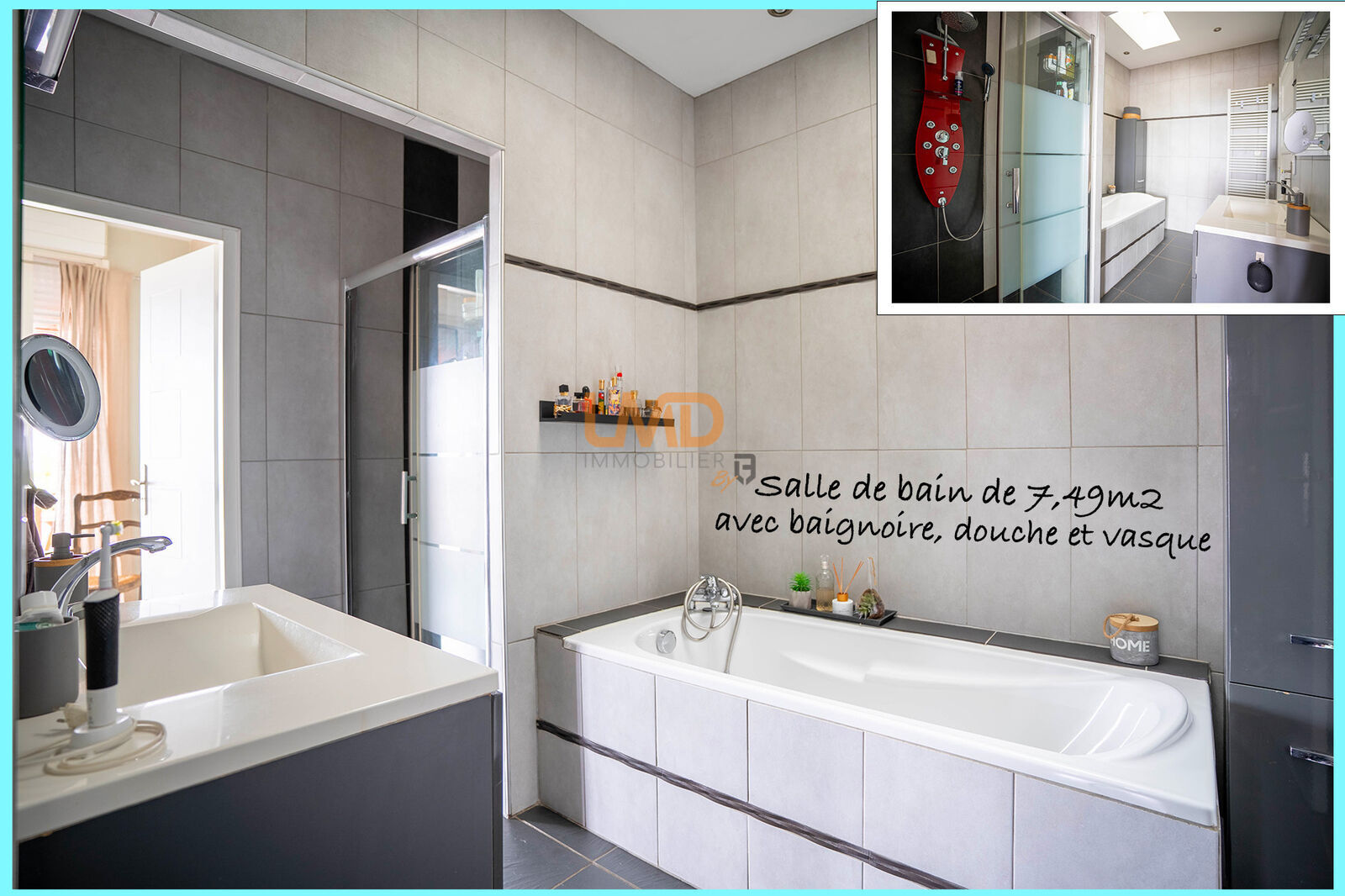 La salle de bain est composée d'une baignoire, d'une douche, d'une vasque et de rangement.