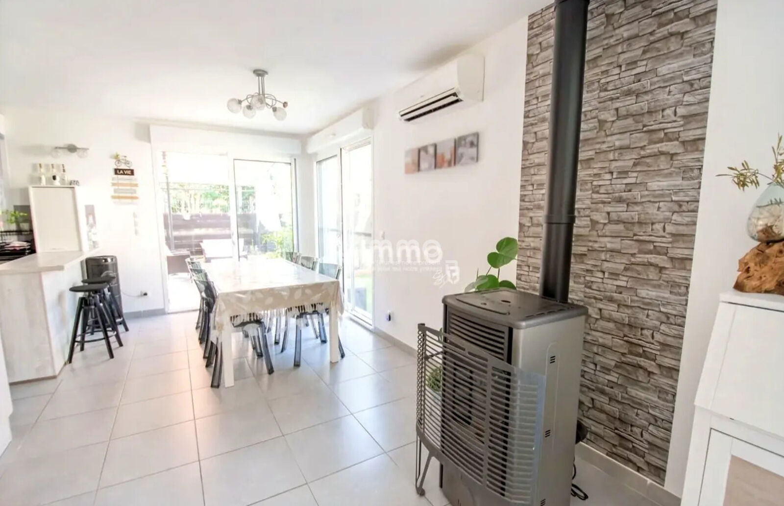 Pour un confort optimal en toutes saisons, la maison est équipée d’un poêle à granulés et d’une climatisation réversible.