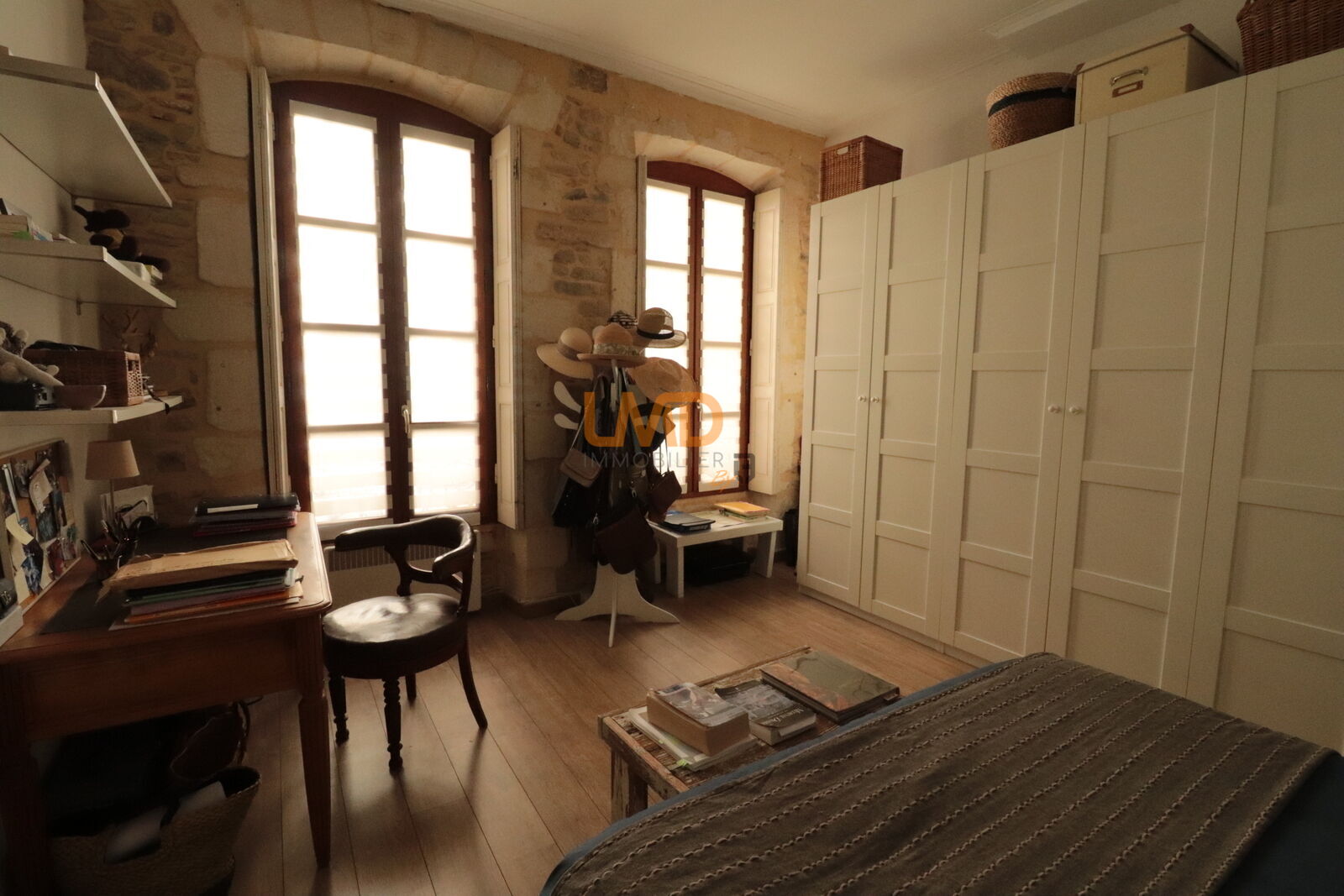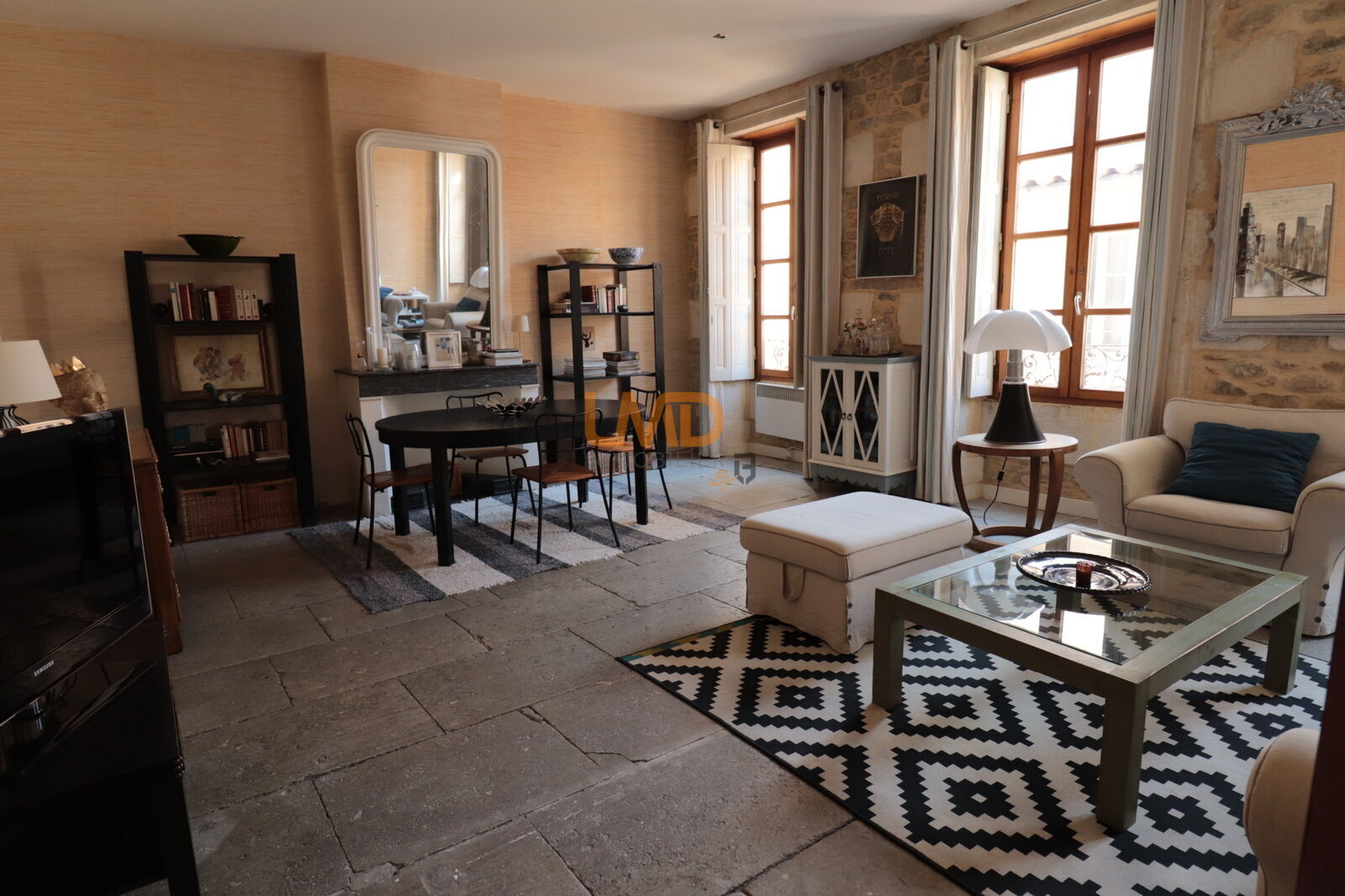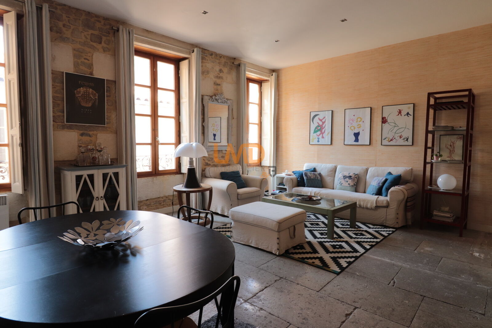 Bel appartement en centre ville avec cave et garage. Belle pièce de vie lumineuse de plus de 30 M2, cuisine semi-séparée totalement équipée, deux belles chambres, salle de bain avec baignoire et douche, wc séparé. Cet appartement est en parfait état, aucun travaux à prévoir. Charme de l'ancien (mur en pierre et bar au sol) et confort moderne. Climatisation dans le séjour. Cour commune (2 copropriétaires).