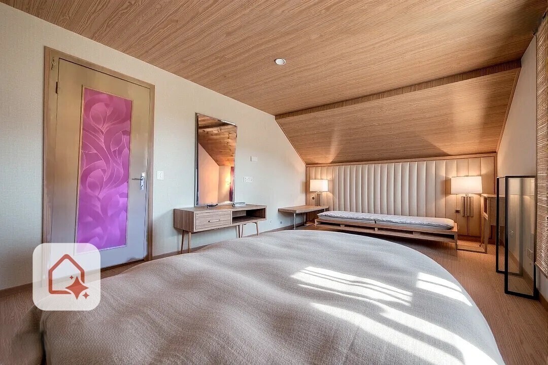 • 2e étage : trois chambres mansardées (9,3 m² – 12,2 m² – 19,2 m² au sol) ainsi qu’une pièce supplémentaire pouvant être aménagée en bureau ou dressing.