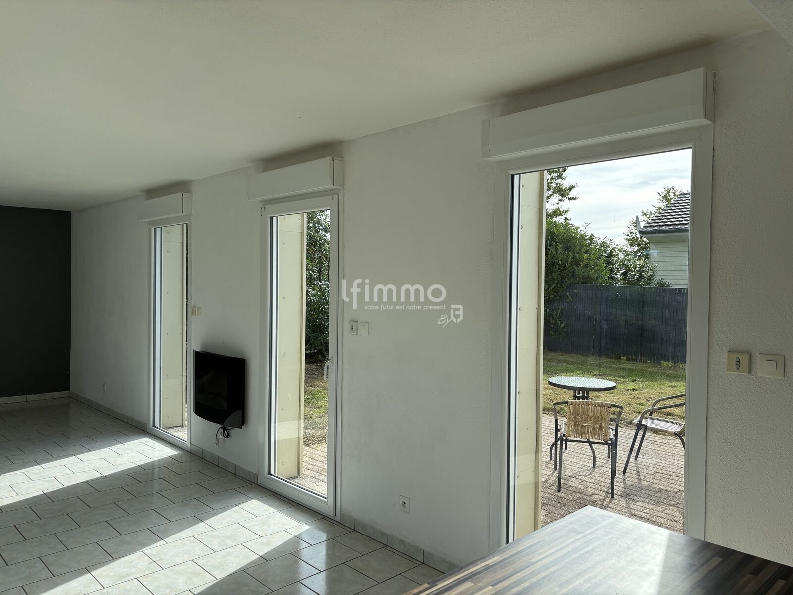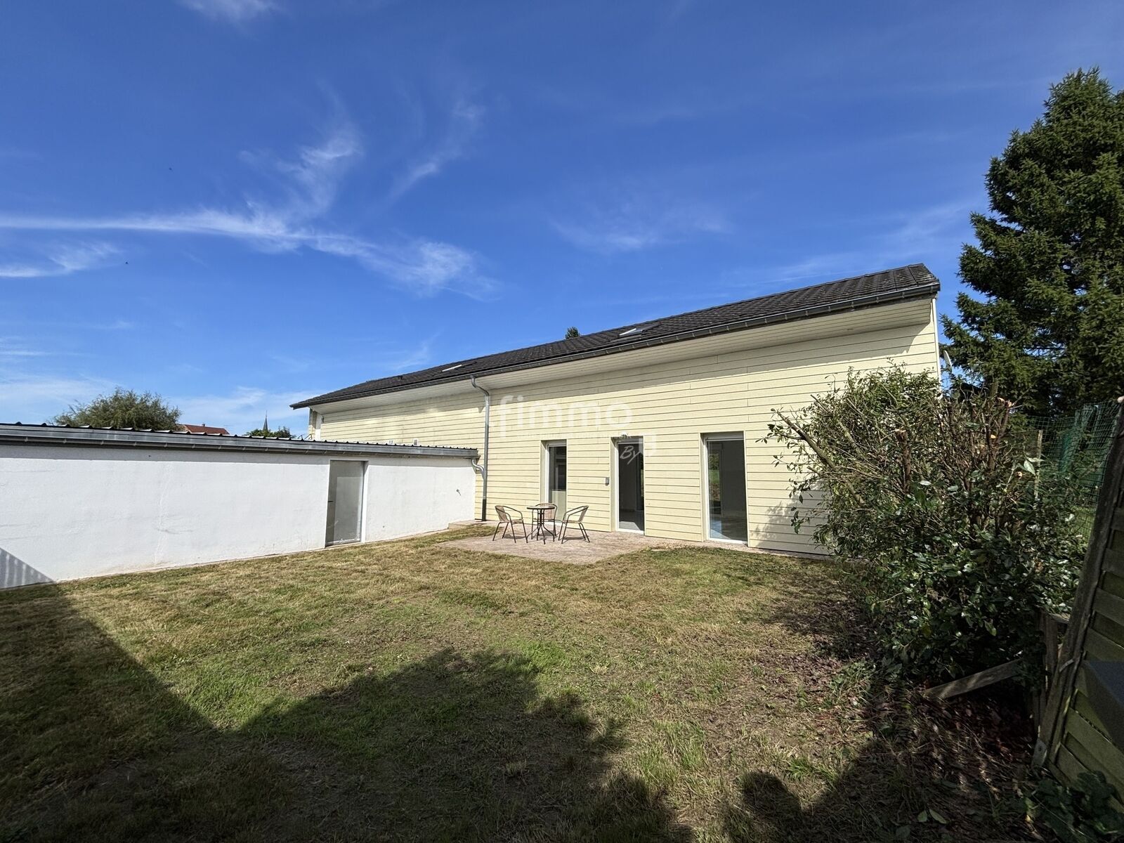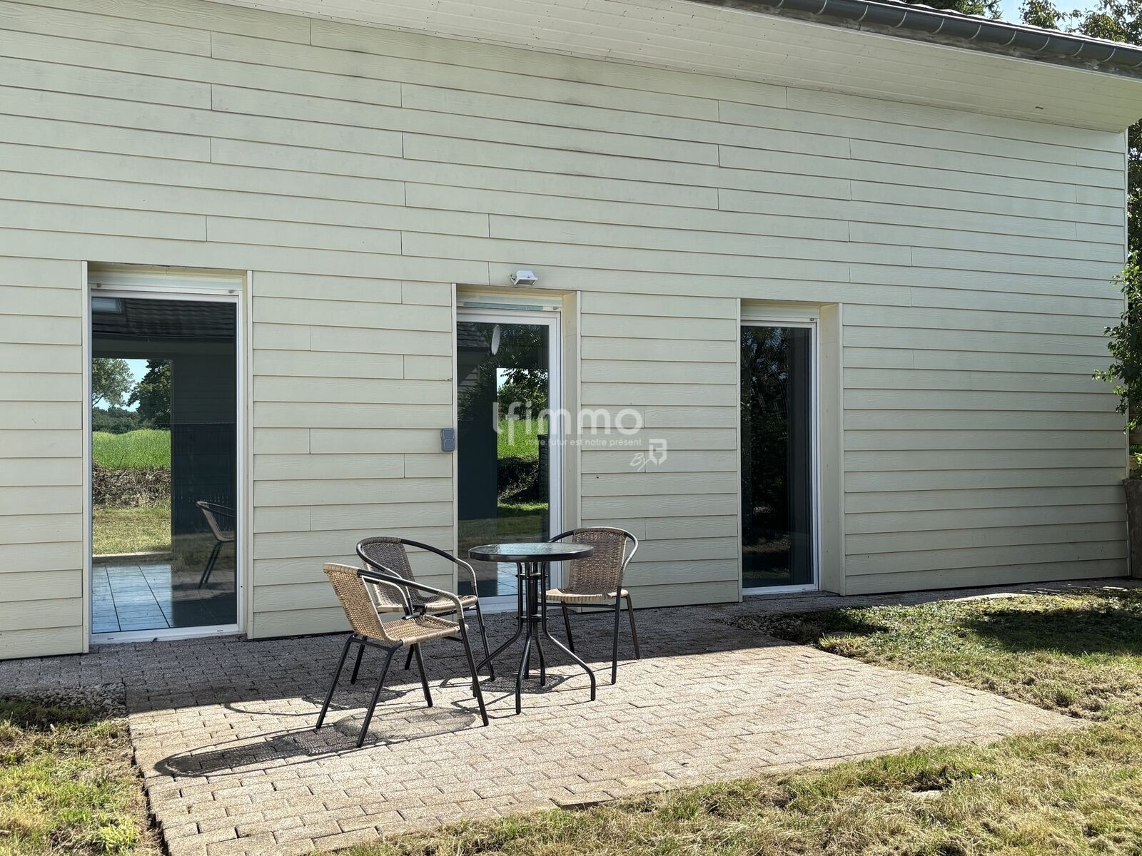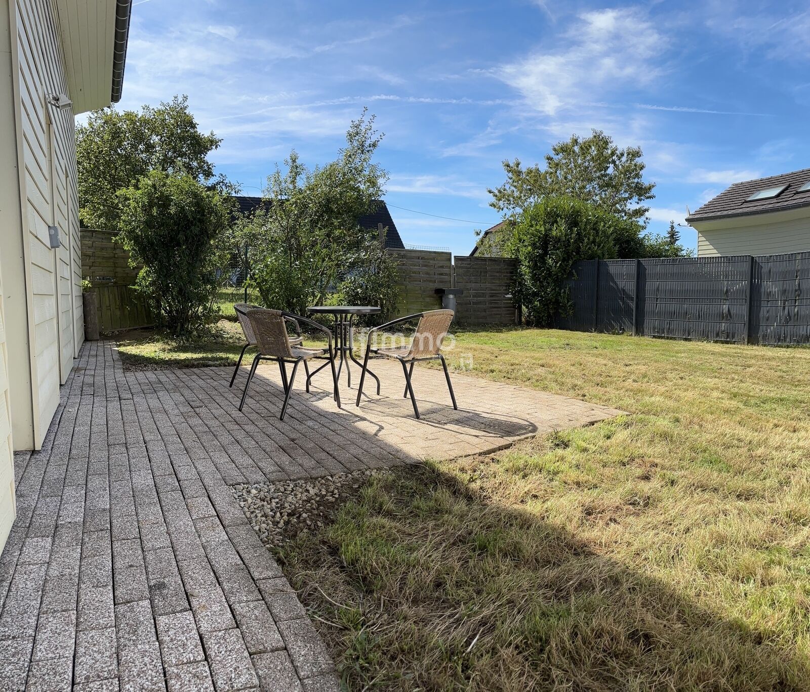 Le patio, intime et arboré, sans vis-à-vis, est entièrement clôturé et donne sur un verger de pommiers. Cet espace extérieur, en plus de sa terrasse, peut accueillir un jardin, un coin détente ou encore une piscine hors-sol pour les enfants.