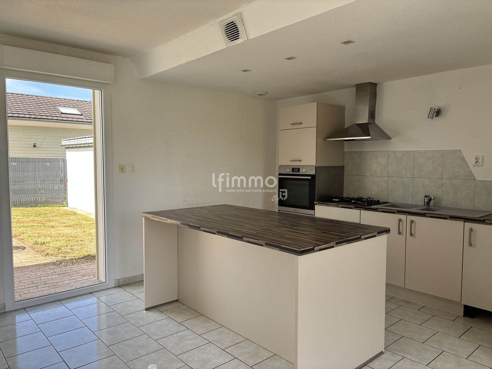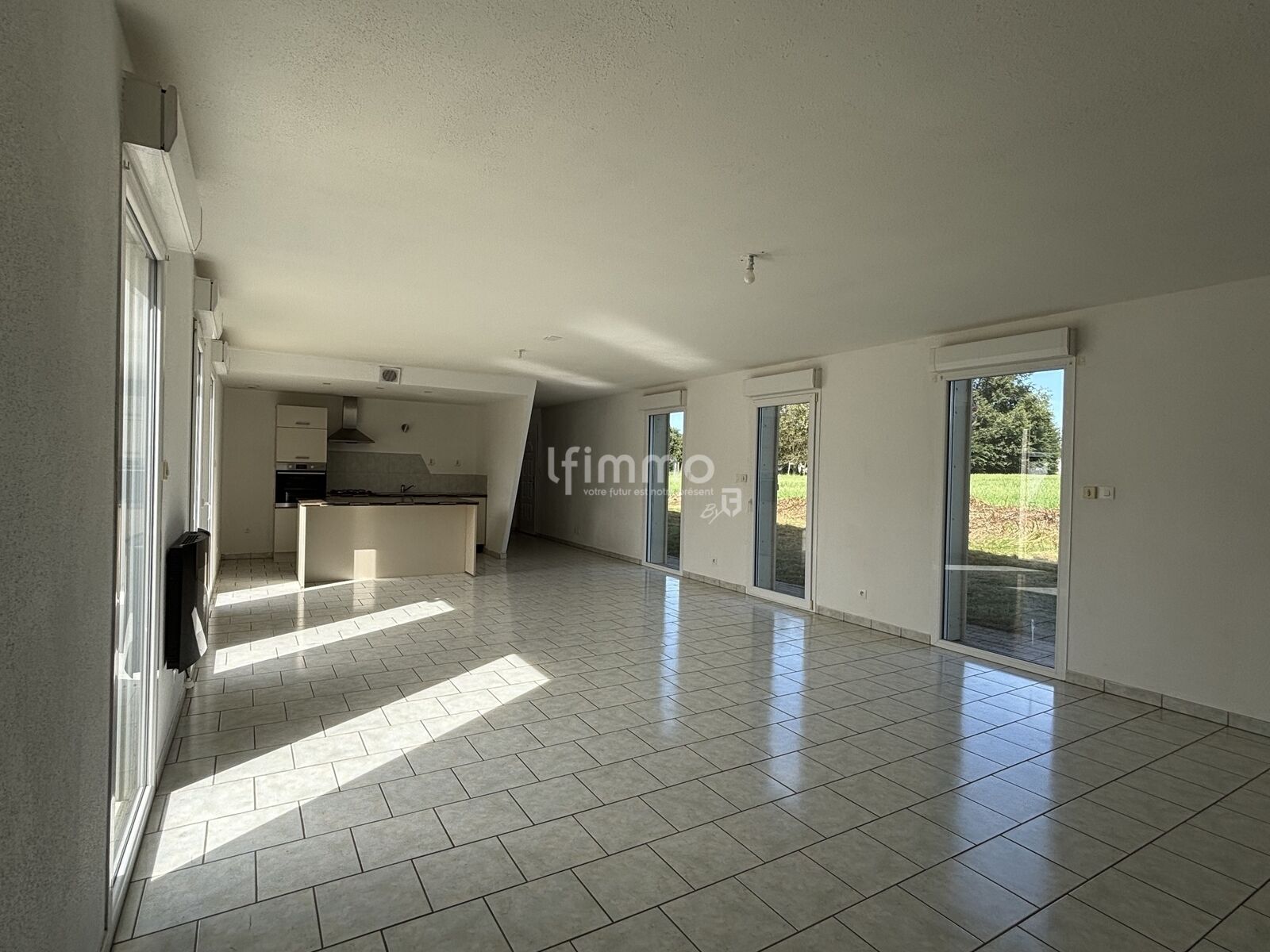 Côté Maison / Au rez-de-chaussée, vous accédez de plain-pied à une vaste pièce de vie de 54 m² baignée de lumière, grâce à ses 2 portes-fenêtres et 4 fenêtres fixes offrant une double vue : d’un côté, la campagne à perte de vue, de l’autre, le patio avec terrasse et jardin. L’espace se prolonge par une cuisine équipée moderne, conviviale et délimitée par un îlot central. Le rez-de-chaussée permet également d’accéder à la salle de bain et aux toilettes, à la chaufferie, à un immense placard mais aussi à une porte permettant d’aller ou de venir des garages.