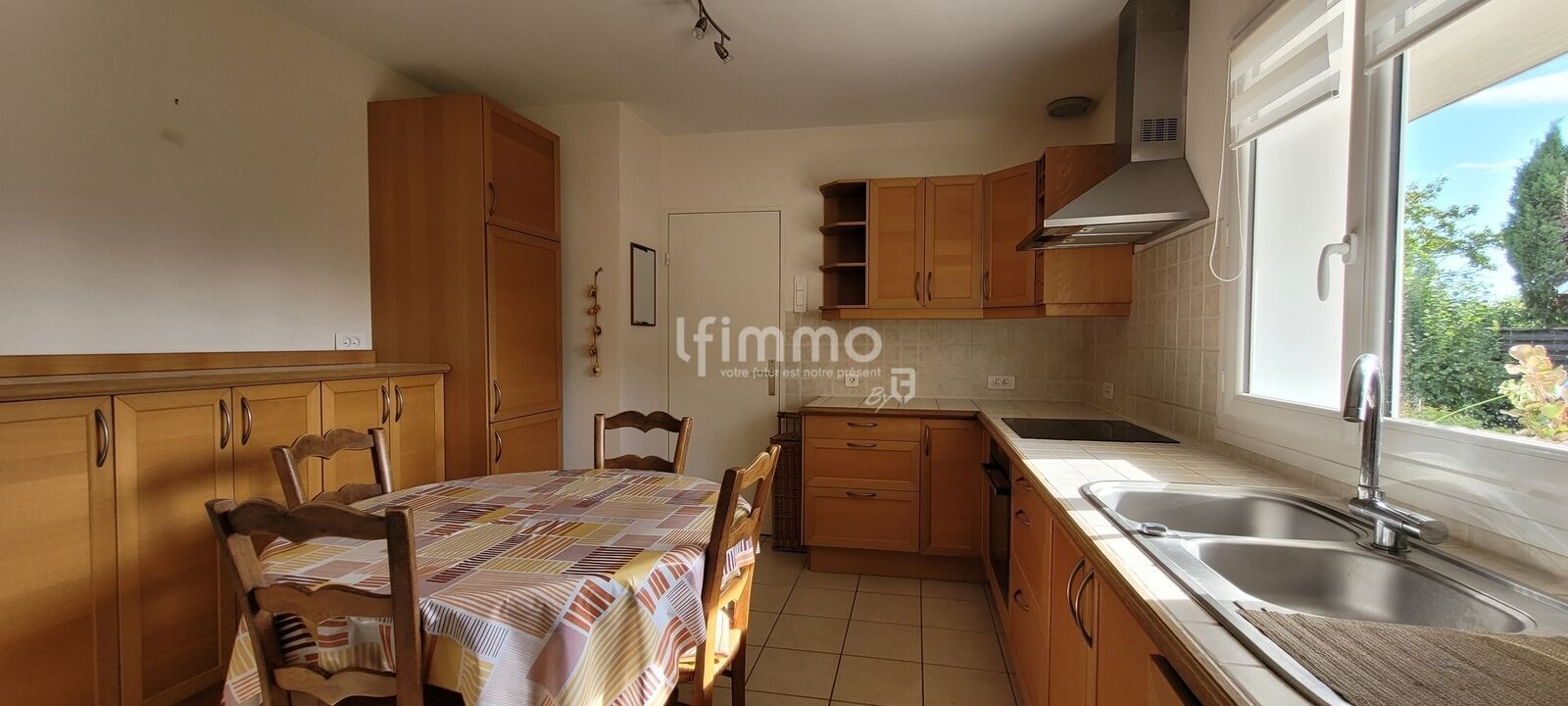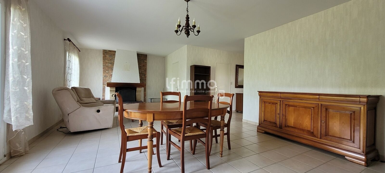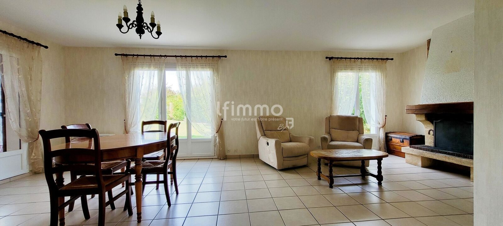 Elle offre une entrée avec rangements, une cuisine indépendante avec accès direct au garage, un séjour lumineux agrémenté d’une cheminée, trois chambres, une salle d’eau avec WC ainsi que des WC séparés. De nombreux placards facilitent l’organisation au quotidien. Vous profiterez également d’un grand garage, véritable atout supplémentaire.