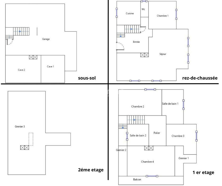 • Étage : palier, suite parentale avec balcon- salle de bain (baignoire + WC), 2 autres chambres, 1 salle d’eau avec WC.