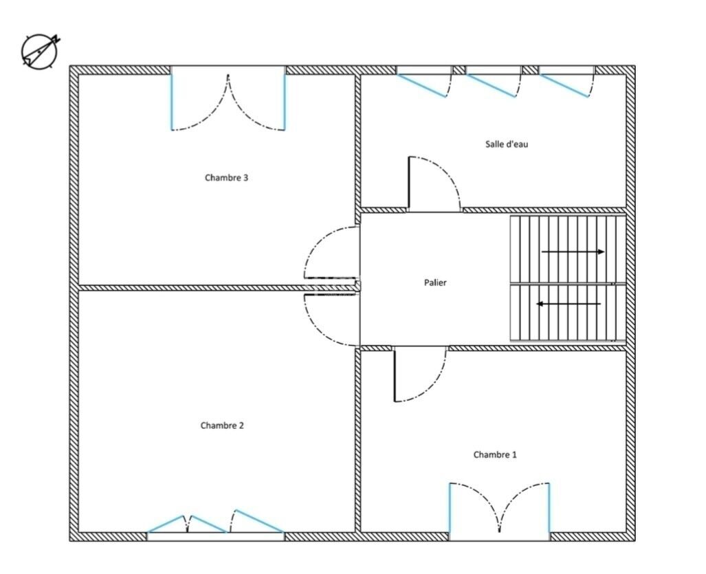 Au 1er étage s'y trouvent 3 chambres, de 9 a 12m2, une salle de douches et un 2ème toilette.