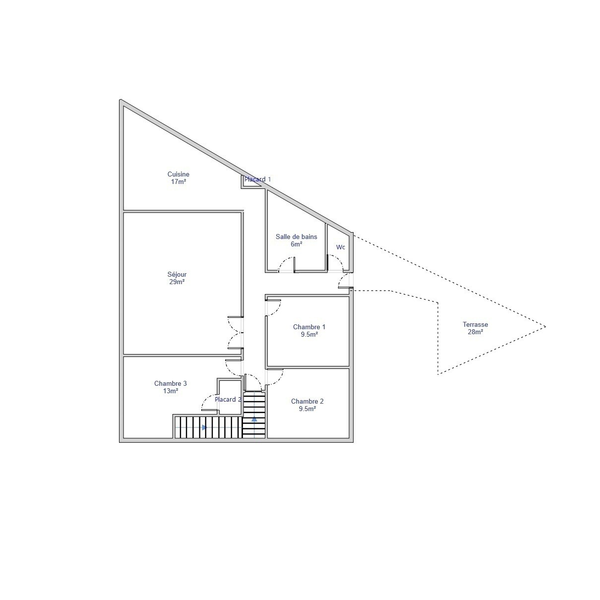 - Trois chambres de 13 m², 9.5 m² et 9.5 m²