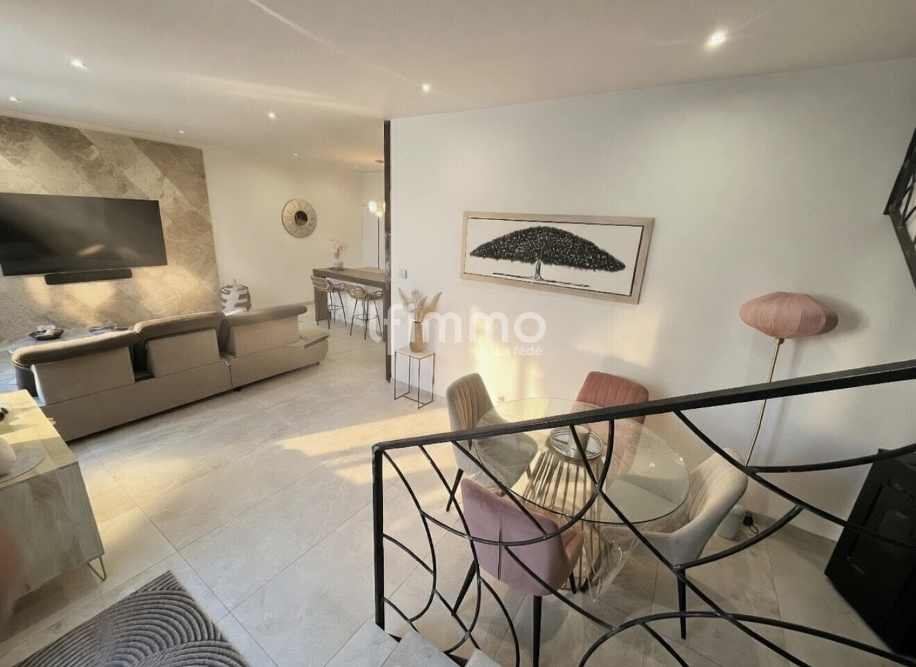 Dès l’entrée, on découvre une pièce de vie lumineuse qui conduit vers une cuisine moderne et super équipée, avec un grand espace buanderie attenant. Ce salon cuisine s’ouvre sur un extérieur agréable, idéal pour profiter de moments en plein air. Cet espace mène également vers un atelier qui offre une solution pratique de rangement supplémentaire.