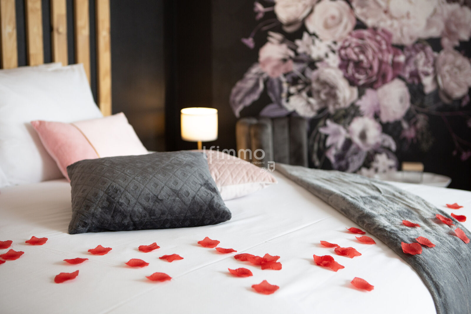 Thème "Love room", lit king size 180cm, baignoire jacuzzi type balnéothérapie, vue dégagée via le balcon orienté sud.