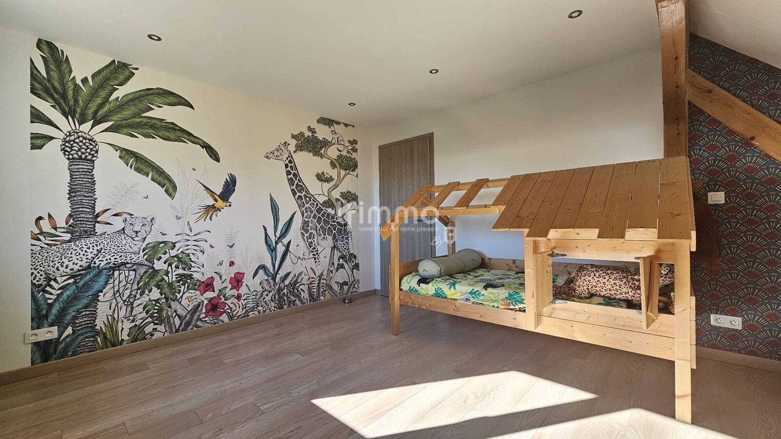 À l’étage, la maison dévoile ses espaces confortables. Un dégagement dessert une grande chambre avec dressing, une deuxième chambre également équipée d’un dressing, ainsi qu’une salle d’eau moderne avec douche, double vasque et toilette, offrant tout le confort nécessaire pour une famille. Chaque pièce bénéficie d’une belle luminosité et d’une atmosphère apaisante.