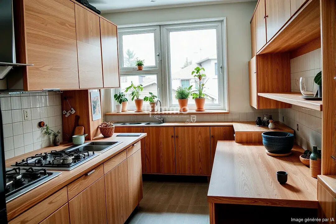 D’une superficie de 57m2 il se compose d’un salon- salle à manger de 20m2 qui se prolonge sur un balcon et sur une grande cuisine séparée qui dispose d’un cellier attenant.