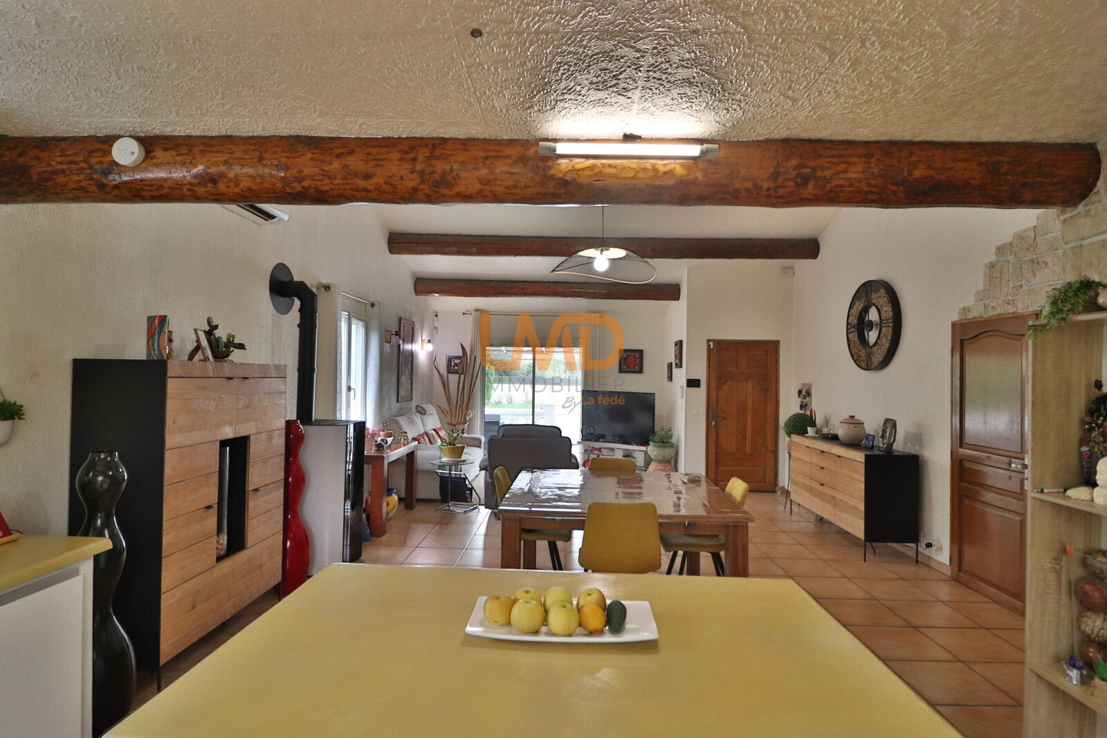 Vous rentrez dans une pièce de vie alliant cuisine équipée et son ilot central, salon, salle-à-manger, sous un beau toit cathédrale chauffée par le poêle à granules. Une vaste buanderie.