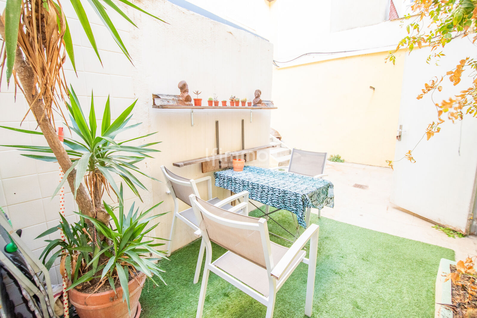 L’entrée se fait par la cour commune, menant à une petite terrasse privative, parfaite pour créer un coin cosy.