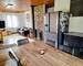 Le coin jour composé d'une belle piece à vivre avec poêle à bois central et une cuisine ouverte moderne toute équipée.