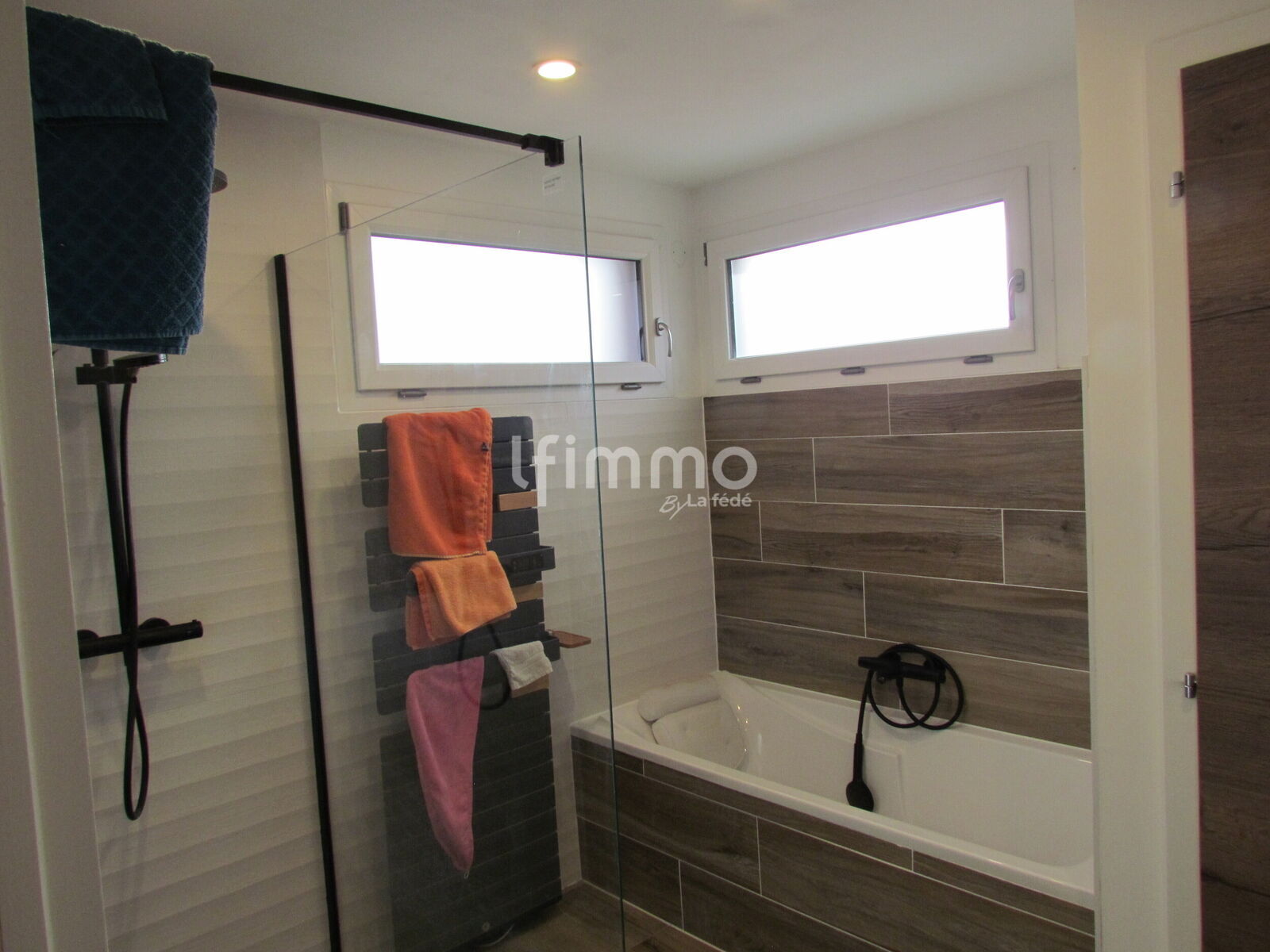 -Une salle de bain avec baignoire, douche et WC