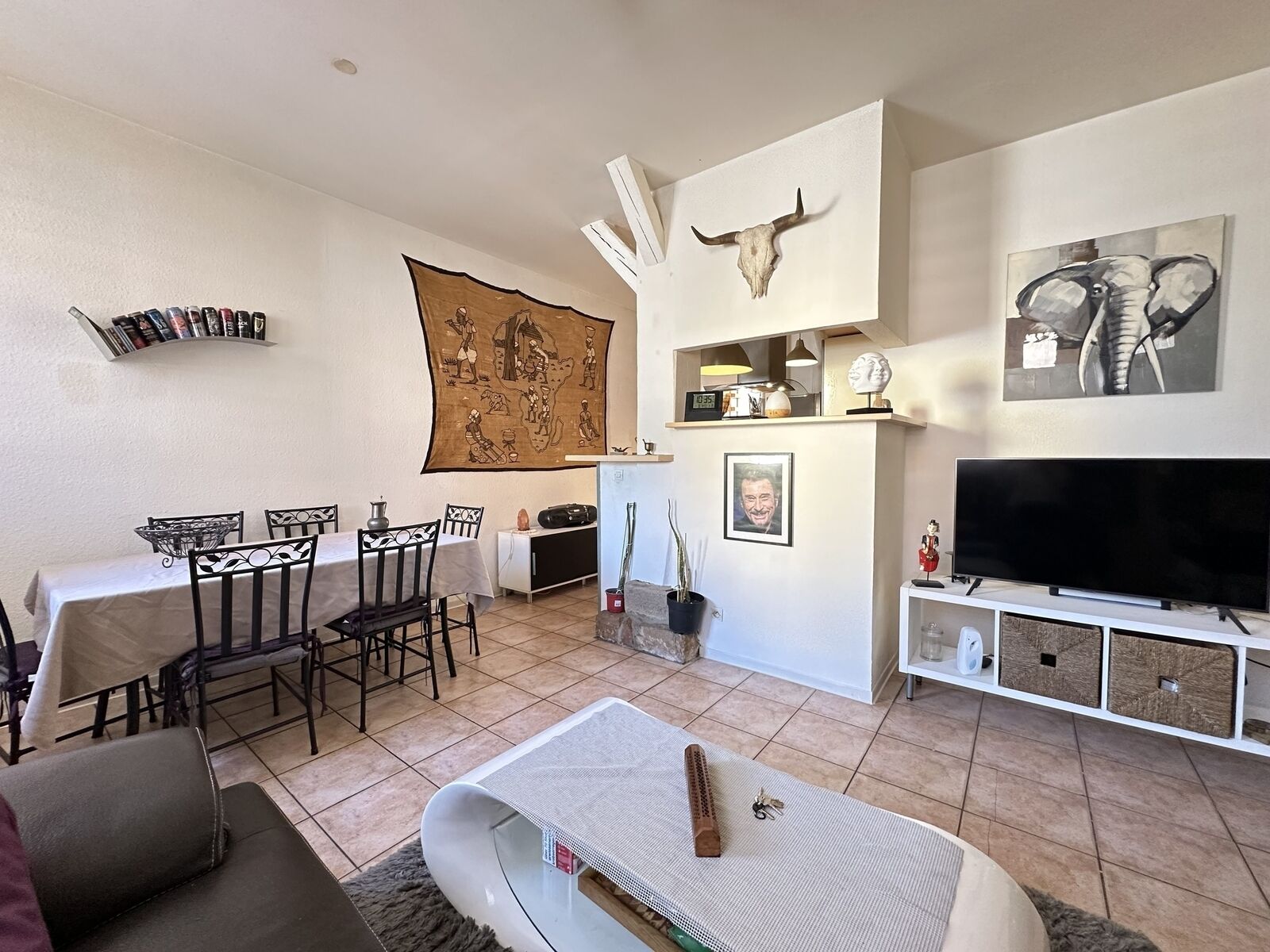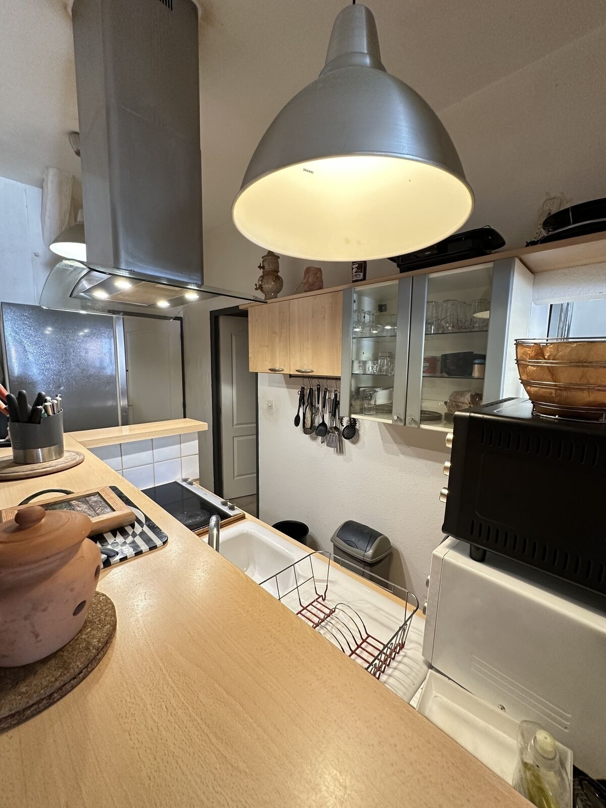 En entrant , nous avons une cuisine totalement équipée centrale et ouverte, 1 salon-séjour, 1 grande chambre avec un espace de rangement, 1 salle de bain avec wc et branchement machine.
