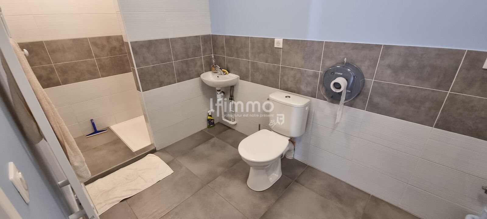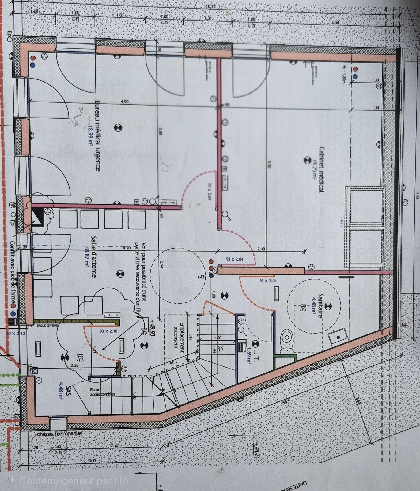 Au rdc une entrée avec ascenseur PMR, Une salle d'attente (6-8 personnes), deux salles de soins/bureau, un local technique, un toilette PMR.