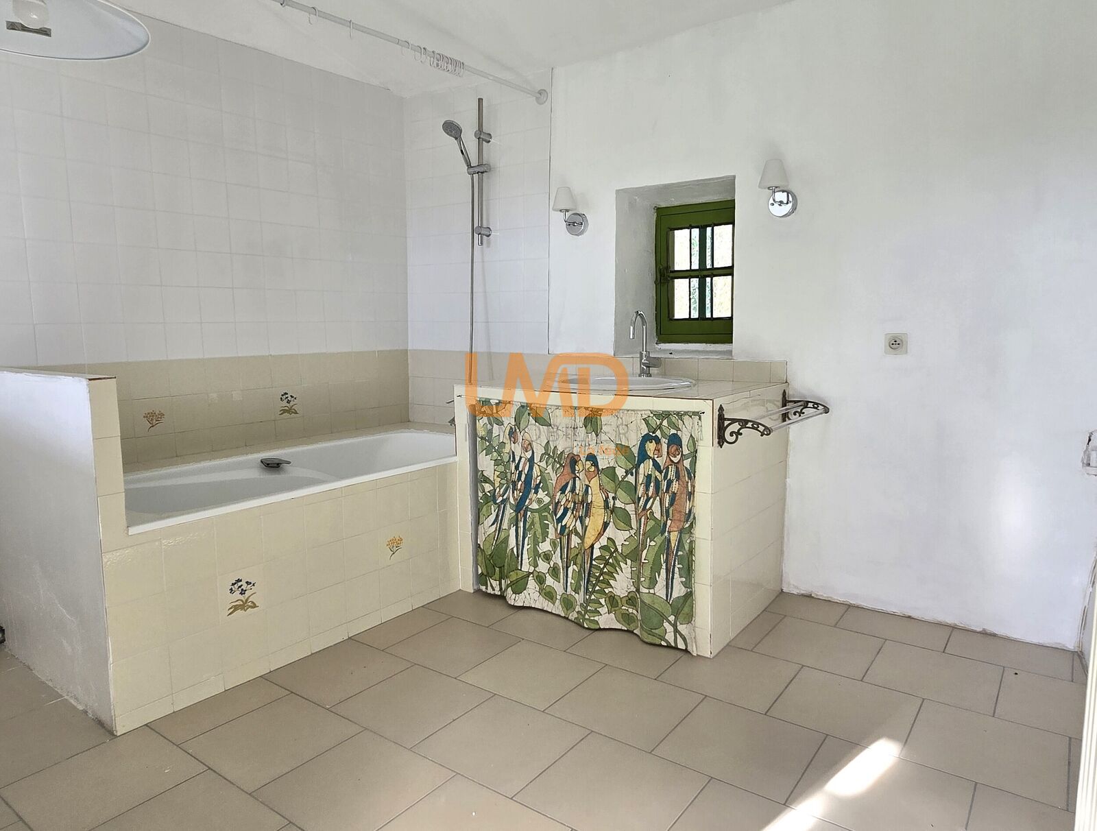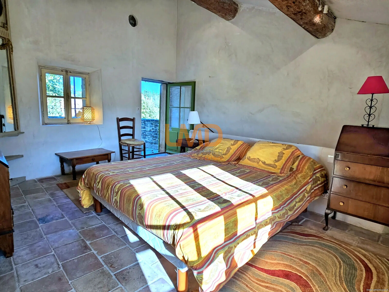 La première partie comprend un hall d’entrée, un salon chaleureux avec cheminée en pierre, une cuisine ouvrant sur une terrasse ombragée par une glycine, une salle de bains, une salle d’eau, un WC indépendant, ainsi que trois chambres, dont l’une dotée d’une terrasse avec vue dégagée sur les oliviers.