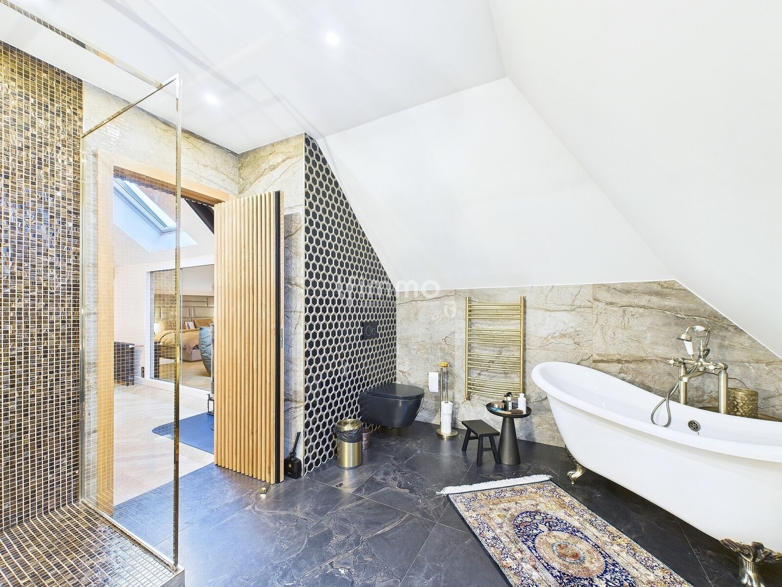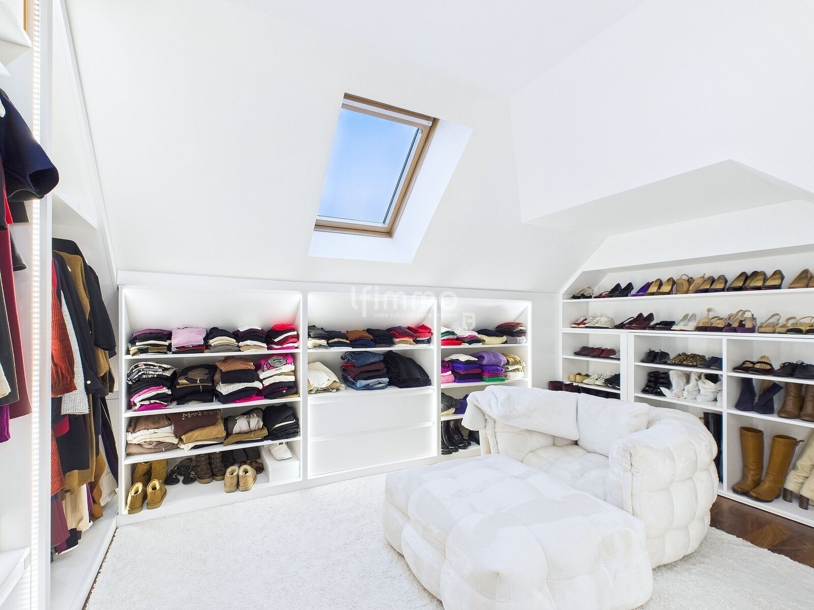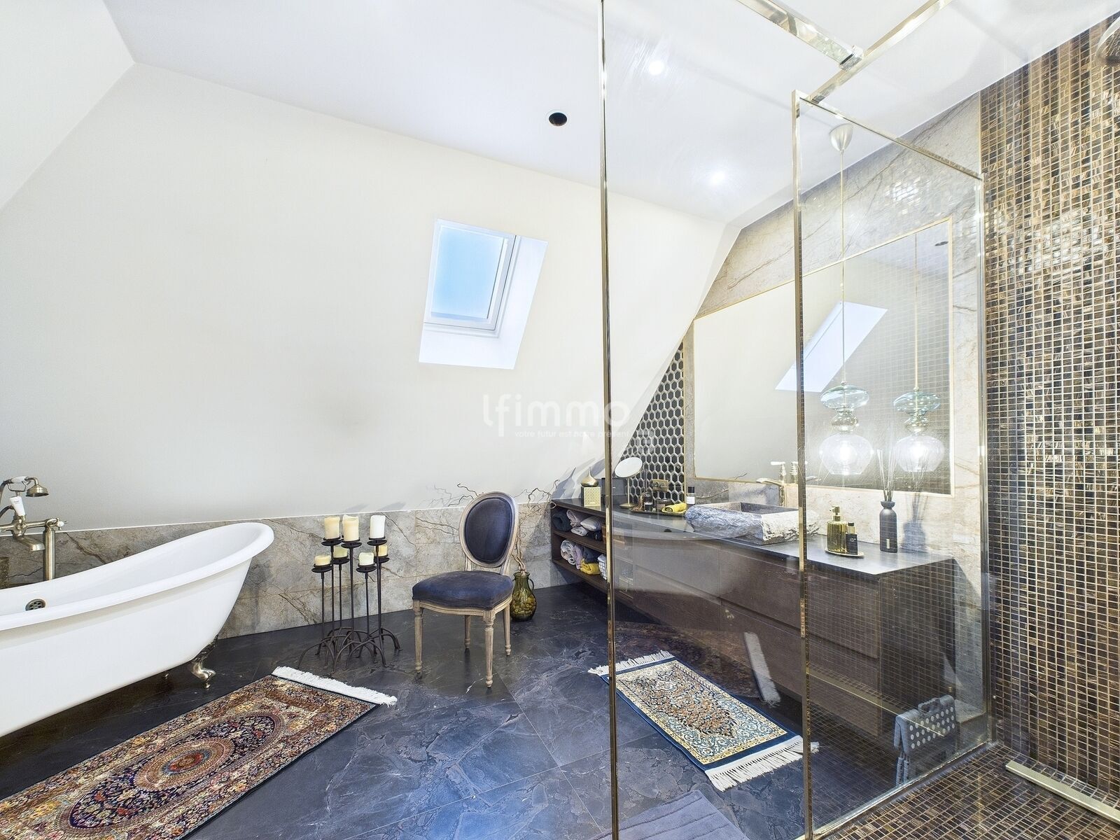 À l’étage, la suite parentale de 37 m² occupe tout l’espace : un vaste volume baigné de lumière avec cheminée, dressing sur mesure de 11 m2, bureau attenant de 9 m² et salle de bain raffinée avec baignoire et douche de 11 m².