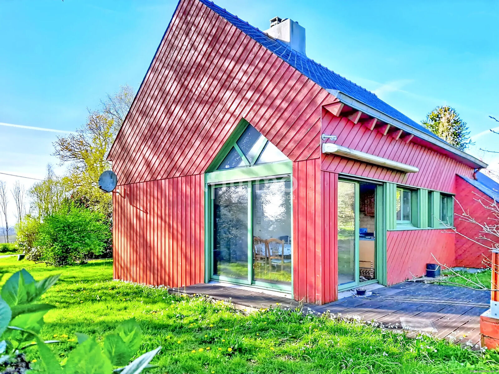Maison bois – 90 m² habitables – 185 m² au total – Terrain 2 540 m² – Double garage – Combles aménageables