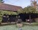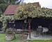 Sur le terrain de 4,7 ares avec dépendances, nous avons un bel espace vert arboré et un abri de jardin avec une terrasse couverte.