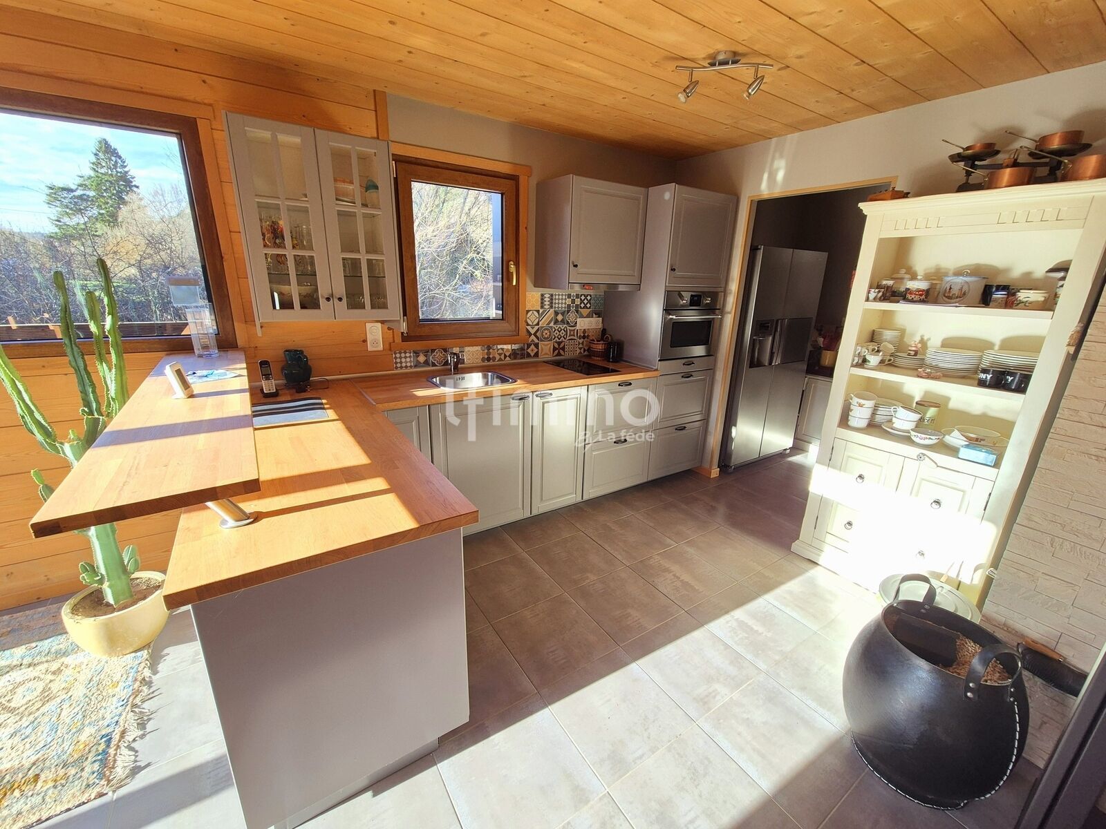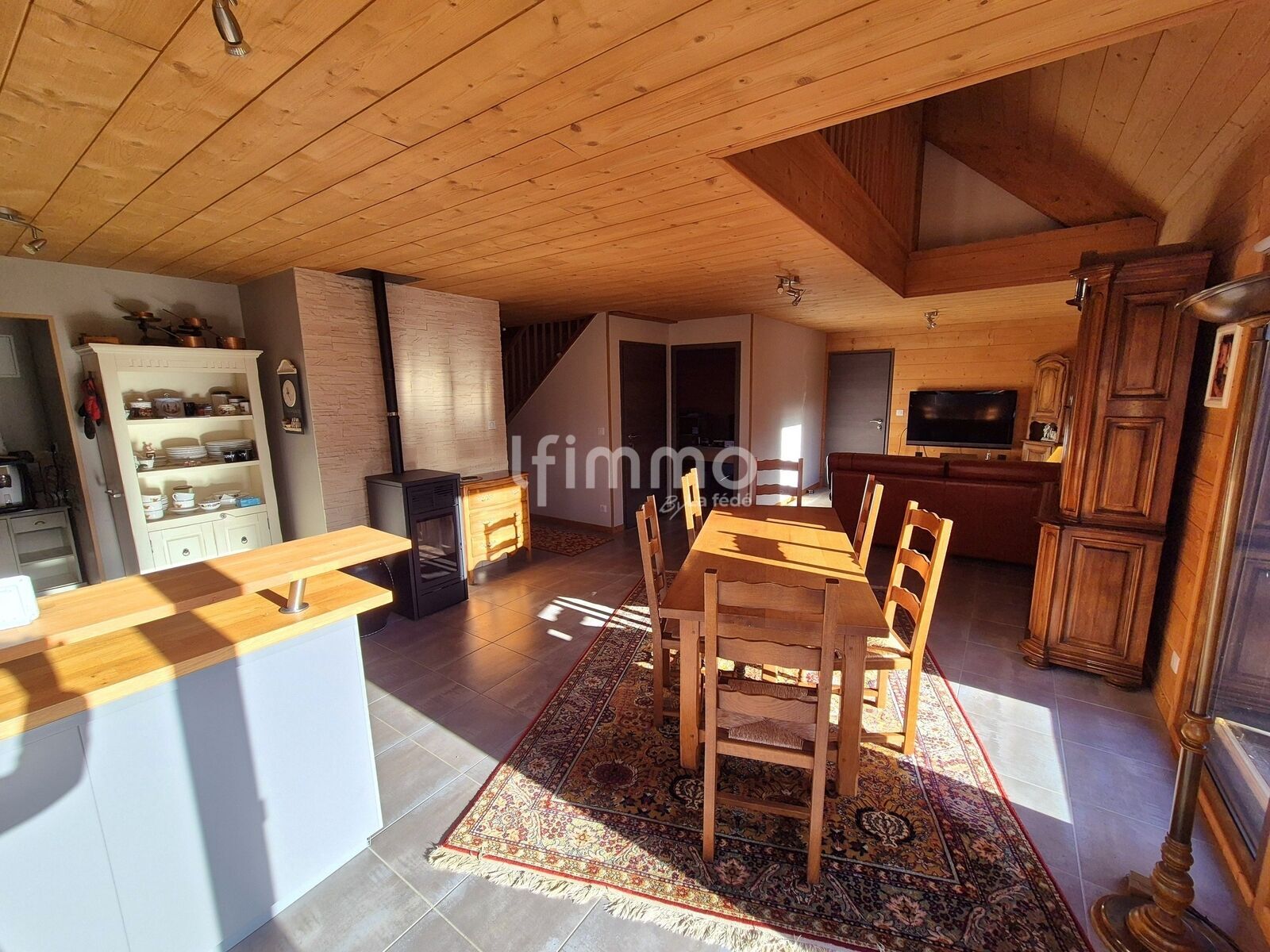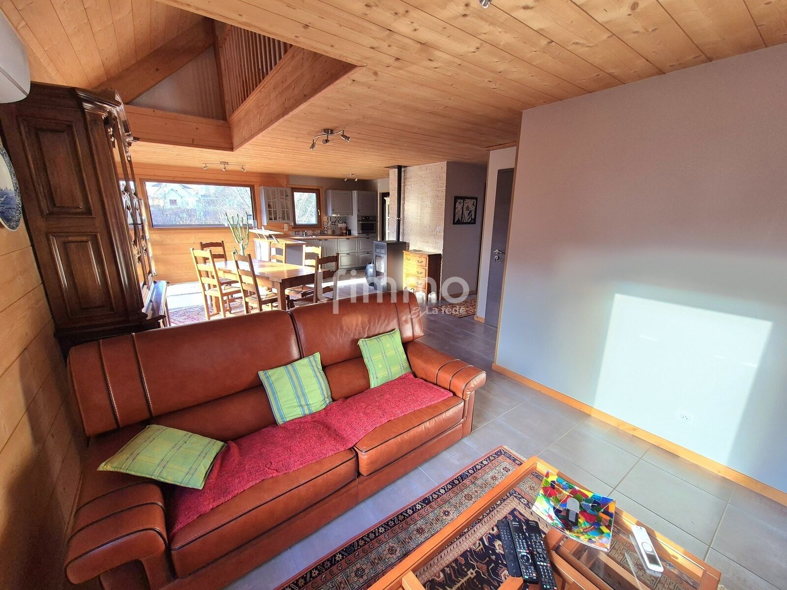 La maison est équipée d'un poêle à granulés dans le salon, d'une pompe à chaleur réversible, d'un ballon électrique, de volets électriques, d'une porte de garage motorisée et de fenêtres double vitrage en bois et pvc.