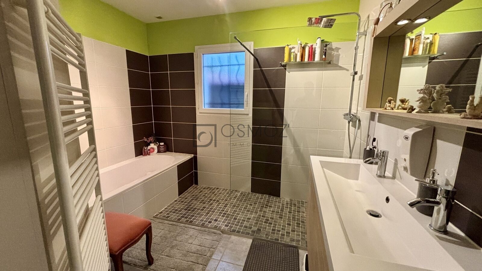 La salle de bain, spacieuse avec ses 7,29 m², comprend une douche à l’italienne, une baignoire et une double vasque, offrant un véritable espace de détente au quotidien.