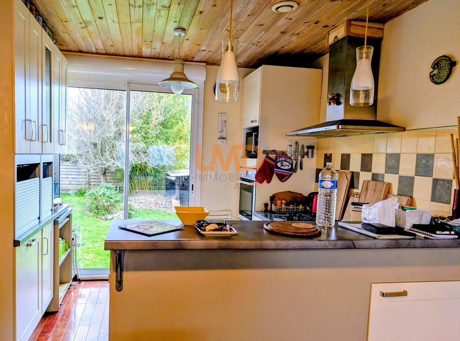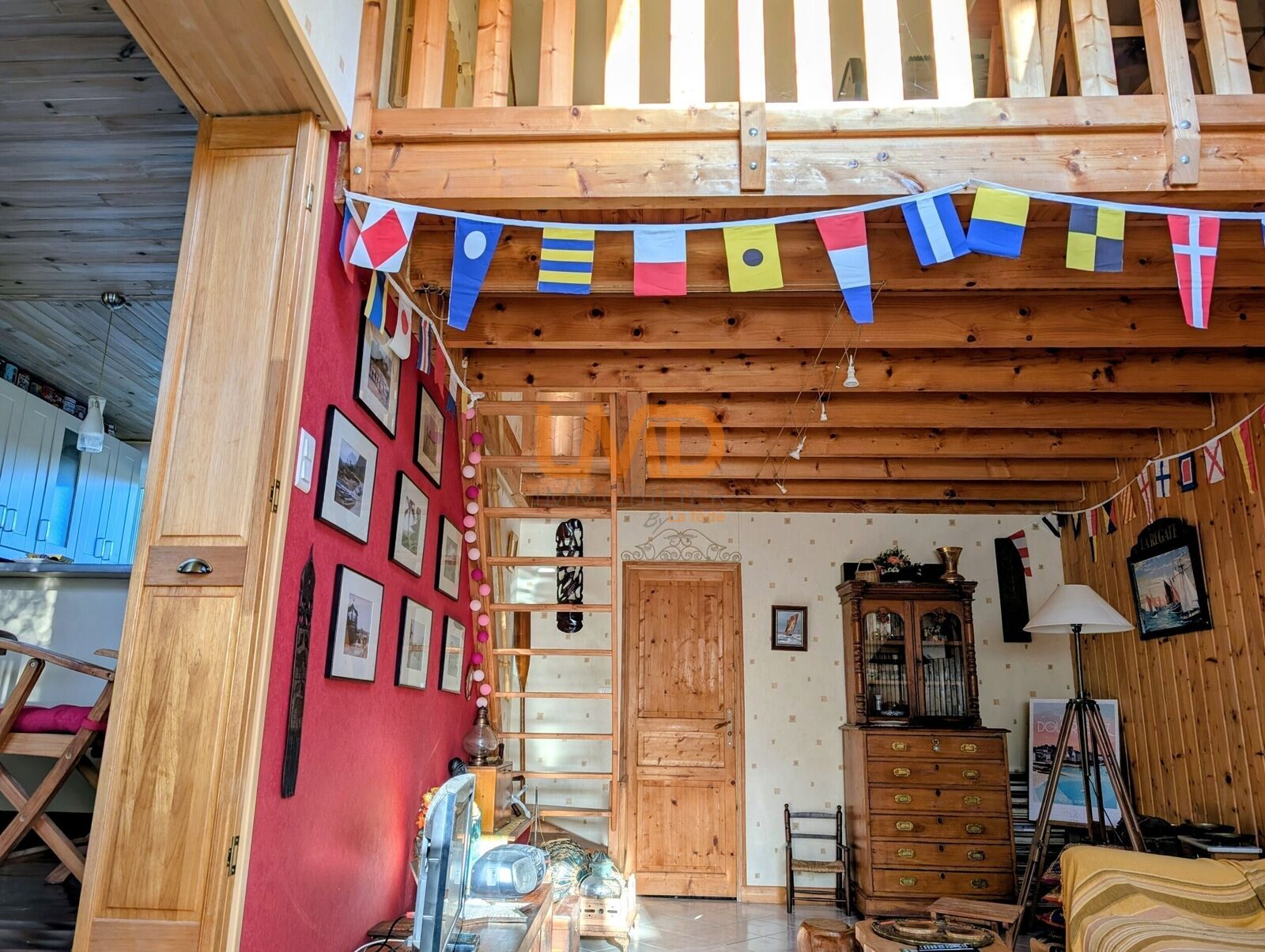 A l'entrée, une marquise. La maison est composée d' une salle à manger donnant sur une cuisine équipée américaine, une pièce de vie indépendante avec mezzanine et une buanderie, 2 chambres, une salle de douche et un toilette.